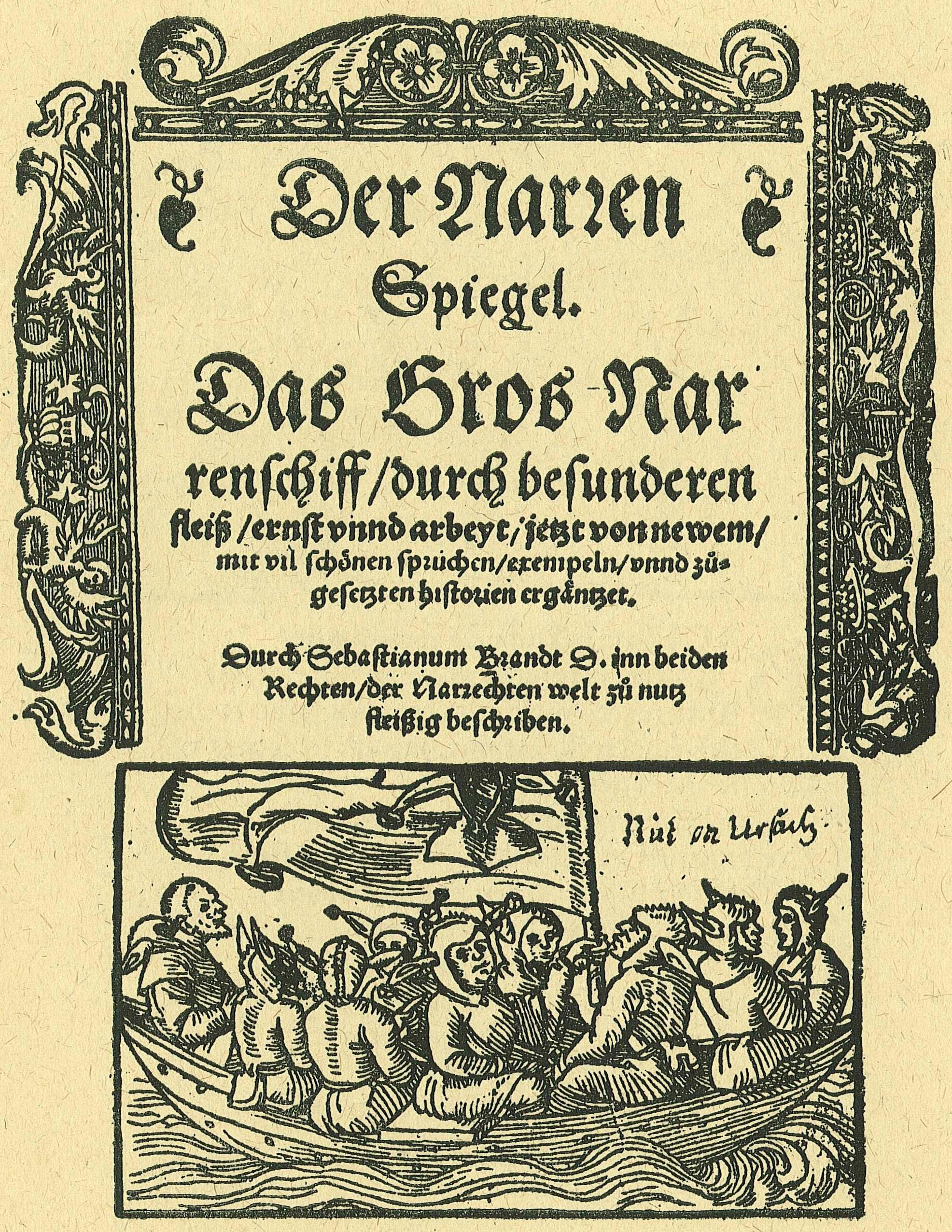 В «Корабле глупцов» дан пестрый парад пороков. Глупцы садятся на корабль, чтобы ехать в Паррагонию (страну глупости). Идет поочередная характеристика глупцов, словесную характеристику подкрепляют ксилографии, исполненные по рисункам Бранта. Автор яркими красками рисует картину жизни кануна Реформации...