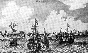 В 1554 году между Китаем и Португалией восстанавливаются торговые отношения, ведущие свою историю от 1516 года. Агрессивная политика Португалии привела к началу военных действий. Китай смог дать отпор, но сил продолжать войну с могущественным противником у Минской династии не было. После того, как торговля между державами была восстановлена, на землях Китая была образована португальская колония в Макао. «На протяжении XVI в. имели место контакты с европейцами. До этого Китай развивал торговые отношения лишь с арабами и персами. Европейцы, первыми оказавшиеся у берегов Китая, были или торговцами или пиратами, а как правило, — и теми и другими одновременно. Первыми установили более или менее регулярные контакты с империей португальцы, прибывшие в Гуанчжоу в 1516 г. Им удалось наладить регулярную торговлю с Китаем и основать свои поселения в ряде приморских городов. Однако в середине XVI в. эти поселения были ликвидированы китайскими властями, и португальцам для ведения торговли был оставлен лишь небольшой порт у побережья недалеко от Гуаньчжоу. Так образовалась португальская колония Макао (1557), и поныне остающаяся ее владением».