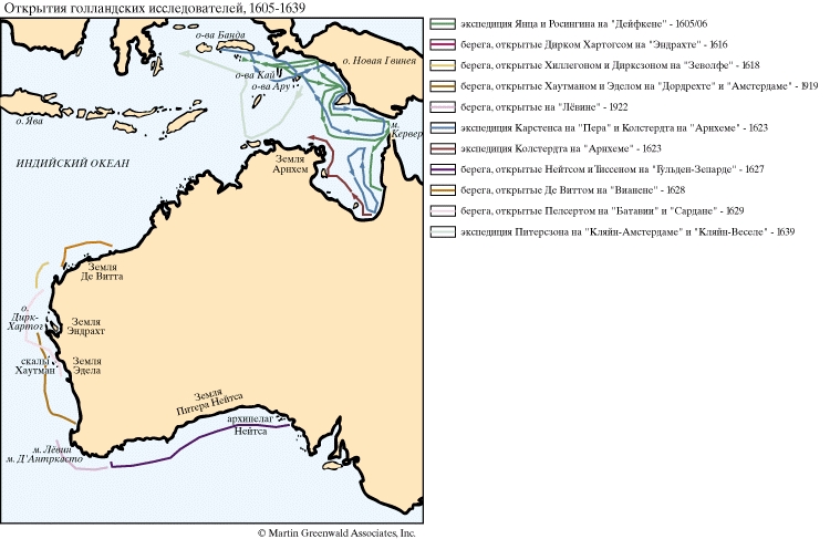 В 1606 году голландский мореплаватель Янсзон Биллем (Виллем Янц) первым из европейцев достигает берегов Австралии. На судне «Дёйфкен» он исследовал залив Карпентария и доплыл до западного берега полуострова Кейп-Йорк. «Несмотря на договор о разделе сфер завоеваний между Поргалией и Испанией, моряки и купцы других стран Европы в поисках наживы и богатства стали проникать в неисследованные части земного шара. Так, Джон Кабот (переселившийся в Англию итальянец Джованни Кабото), отправившийся в экспедицию с целью найти северо-западный путь в Индийский океан, впервые достиг в 1497 г. Ньюфаундленда или полуострова Лабрадор, а его сын — Себастьян Кабот — в 1498 г. достиг северо-восточного берега Северной Америки и исследовал его. В дальнейшем английские и французские мореплаватели исследовали восточную часть Северной Америки, а голландцы в результате ряда плаваний, совершённых в течение XVII в., открыли Австралию, смутные сведения о которой имелись ещё у античных географов. В 1606 г. голландское судно под начальством Виллема Янца впервые достигло северного побережья Австралии, а в 1642—1644 гг. голландский мореплаватель Тасман совершил к австралийским берегам два плавания и, пройдя южнее Австралии до открытого им острова Тасмания, доказал, что Австралия является самостоятельным новым материком. Лондонские купцы, по их собственному выражению, «видя, как удивительно быстро растёт богатство испанцев и португальцев вследствие открытия новых стран и поисков новых торговых рынков», организовали в 1552 г. экспедицию из трёх кораблей под начальством Уиллоуби, предпринявшую попытку найти северо-восточный проход в Китай, обогнув побережье Сибири. Корабли экспедиции Уиллоуби в Баренцевом море были разделены бурей, два из них были затёрты льдами в южной части этого моря, и весь их экипаж замёрз, а третий прошёл в Белое море, достиг устья Северной Двины; его капитан Ченслер побывал в Москве и был принят Иваном Грозным. В 1556 и 1580 гг. англичане вновь пытались найти северо-восточный проход, однако далее входа в Карское море их корабли из-за сплошных льдов пройти не смогли. Голландские купцы в конце XVI в. снарядили на поиски этого прохода три экспедиции, которыми руководил голландский мореплаватель Биллем Баренц, но и эти корабли не смогли пройти восточнее Новой Земли, на которой Баренц зазимовал вовремя своей последней экспедиции (1596—1597 гг.), так как его корабль был затёрт льдами».