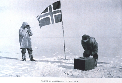 Амундсен велел застрелить тех собак, которые стали им не нужны, - "24 наших мужественных товарища", - поскольку теперь путь стал легче. Солнце больше не заходило, и покрытое снегом плоскогорье было залито ослепительным светом. Пять человек на лыжах летели вперед, словно участники олимпийского забега.14 декабря с помощью карт и секстанта они определили, что достигли заветной точки на белой равнине, на высоте 3000 метров над уровнем моря. Нетронутая снежная гладь, без малейших признаков того, что здесь кто-то побывал до них... Итак, дерзкая мечта стала реальностью: они покорили Южный полюс первыми!»