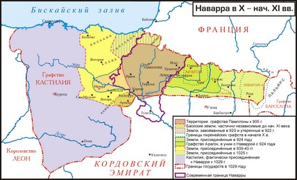 В 911 году король Наварры Санчо I Гарсес разбил у крепости Руэста (на западе Арагона) войска мусульманского губернатора Уэски Мухаммада ал-Тавиля и подчиняет своей власти графство Арагон. «Основатель новой династии Санчо Гарсес I (905-925) начинает новую экспансию на юг. Он занимает Нахеру, строит крепость Вигуэру. Ему приходится отражать натиск со стороны Абдаррахмана III, захватившего Пампилону. В конечном счете король Наварры сохранил свои владения, но его преемники вынуждены были признать верховную власть эмира. Наваррский король завладел графством Арагон. Зенита своего политического могущества Наварра достигла при короле Санчо III Великом (1000-1035). Он включил в состав королевства области Собрарбе и Рибаргорсу, графство Кастилию т оккупировал Леон. Его влияние распространялось на Гасконь и Барселону. Начальная история Арагона не освещена источниками. К началу IX века Арагон – маленькое политическое образование в северо-восточной части полуострова, в горных долинах Ронкаля и Хистайна, обязанное своим наименованием реке Арагон. Центром этого графства была крепость Хака. На западе от Арагона находились владения Памплоны, на востоке – графство Урхель и Барселона, к югу – часть долины реки Эбро, остававшаяся в руках мусульман. Материальные и людские ресурсы графства в это время были слишком незначительны для того, чтобы оно самостоятельно осуществляло Реконкисту. Во время правления наваррского короля Гарсия Санчеса (925-970) Арагон окончательно вошел в состав королевства Наварры».