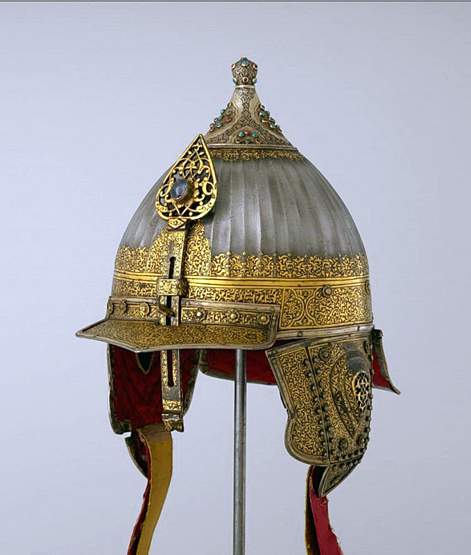 Шишак (шапка Ерихонская) князя Федора Ивановича Мстиславского. Неизвестный турецкий мастер, XVI в. Золото, серебро, сталь булатная, рубины, бирюза, ткань шелковая Ковка, чеканка, насечка золотом, резьба Диаметр: 19,0 см Оружейная палата, Москва Фрагмент. Смотреть полностью.