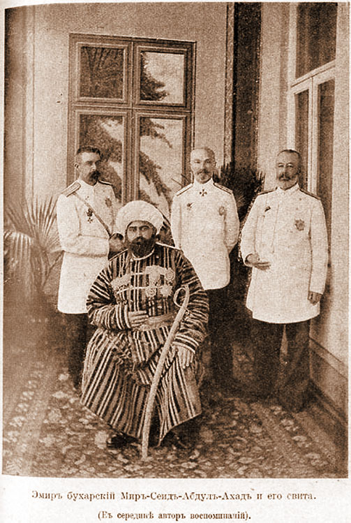 Портрет Эмира Бухарского Мир-Сеид-Абдул-Ахада в окружении русских офицеров. Фотография из публикации: Федоров Г.П. Моя служба в Туркестанском крае. (1870-1910 года) // Исторический вестник. № 11, 1913 (В середине - автор воспоминаний) Фрагмент. Смотреть полностью.