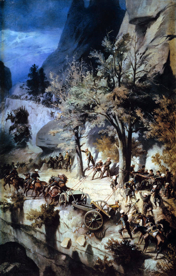 Переход лейб-гвардии 6-й Донской батареи через Балканы. 1877 год. Художник: Шарлемань Адольф Иосифович 1826-1901 100 х 63 см Холст, масло. 1879 Центральный военно-исторический музей артиллерии, инженерных войск и войск связи Санкт-Петербург. Фрагмент. Смотреть полностью.