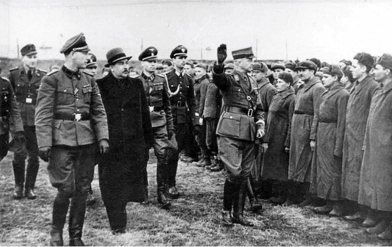 Глава германской администрации Карл Литцманн и глава эстонской администрации Хьяльмар Мяэ (в штатском) проводят смотр эстонских добровольцев в г. Вильянди. Осень 1941 г. Фотография Автор неизвестен Фрагмент. Смотреть полностью.