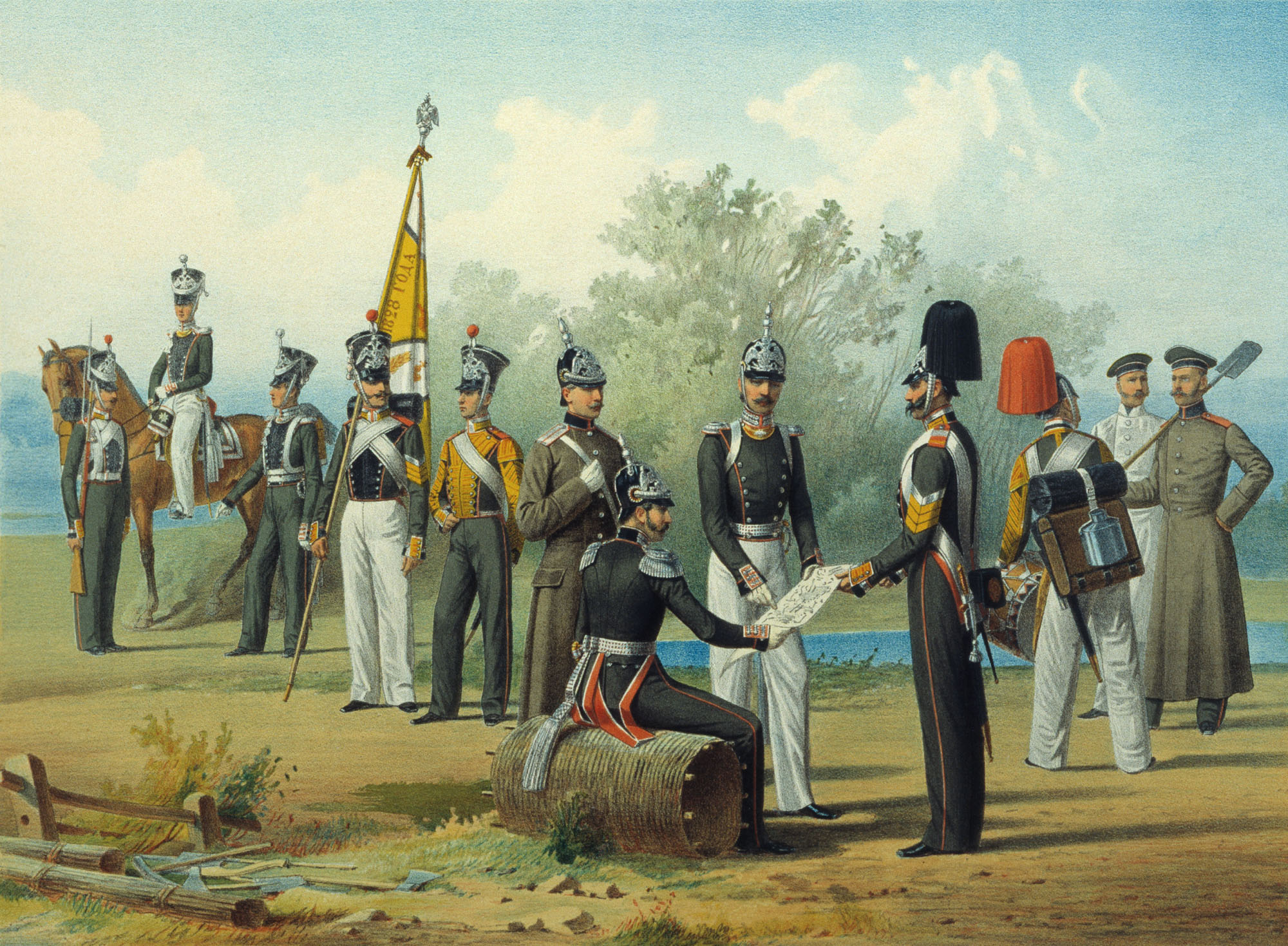 Лейб-Гвардии Сапёрный батальон в 1826 году. Цветная литография конца XIX в. Фрагмент. Смотреть полностью.