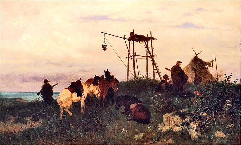 Застава над Днепром (Казаки) Художник Юзеф Брандт (1841 – 1915) Холст, масло. 33 x 54 cm. 1878. Частная коллекция. Польша Фрагмент. Смотреть полностью.