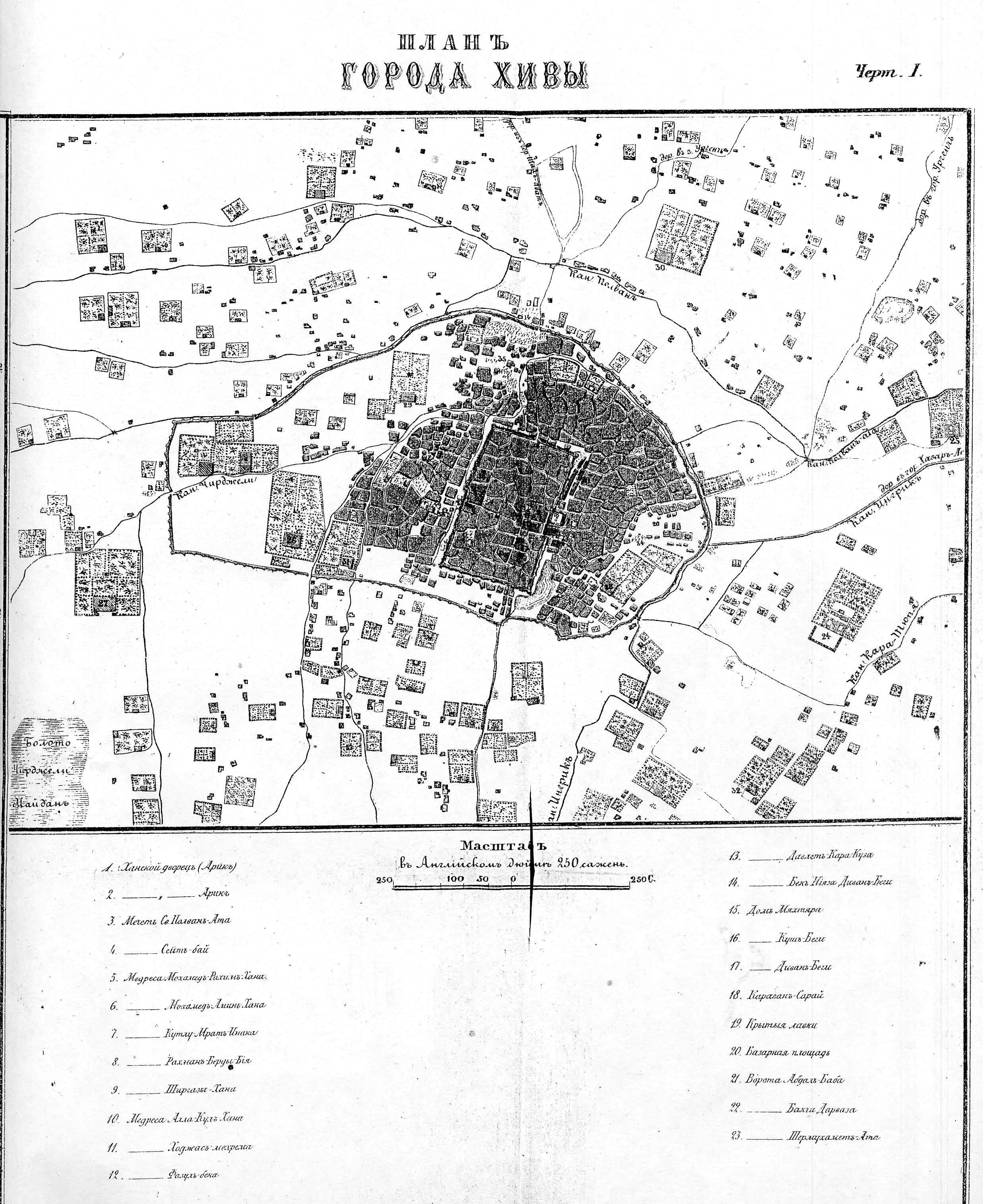 План города Хивы из книги : Саранчов Евграф Семёнович. Хивинская экспедиция 1873 года (Записки очевидца сапера). СПб. 1874 Фрагмент. Смотреть полностью.