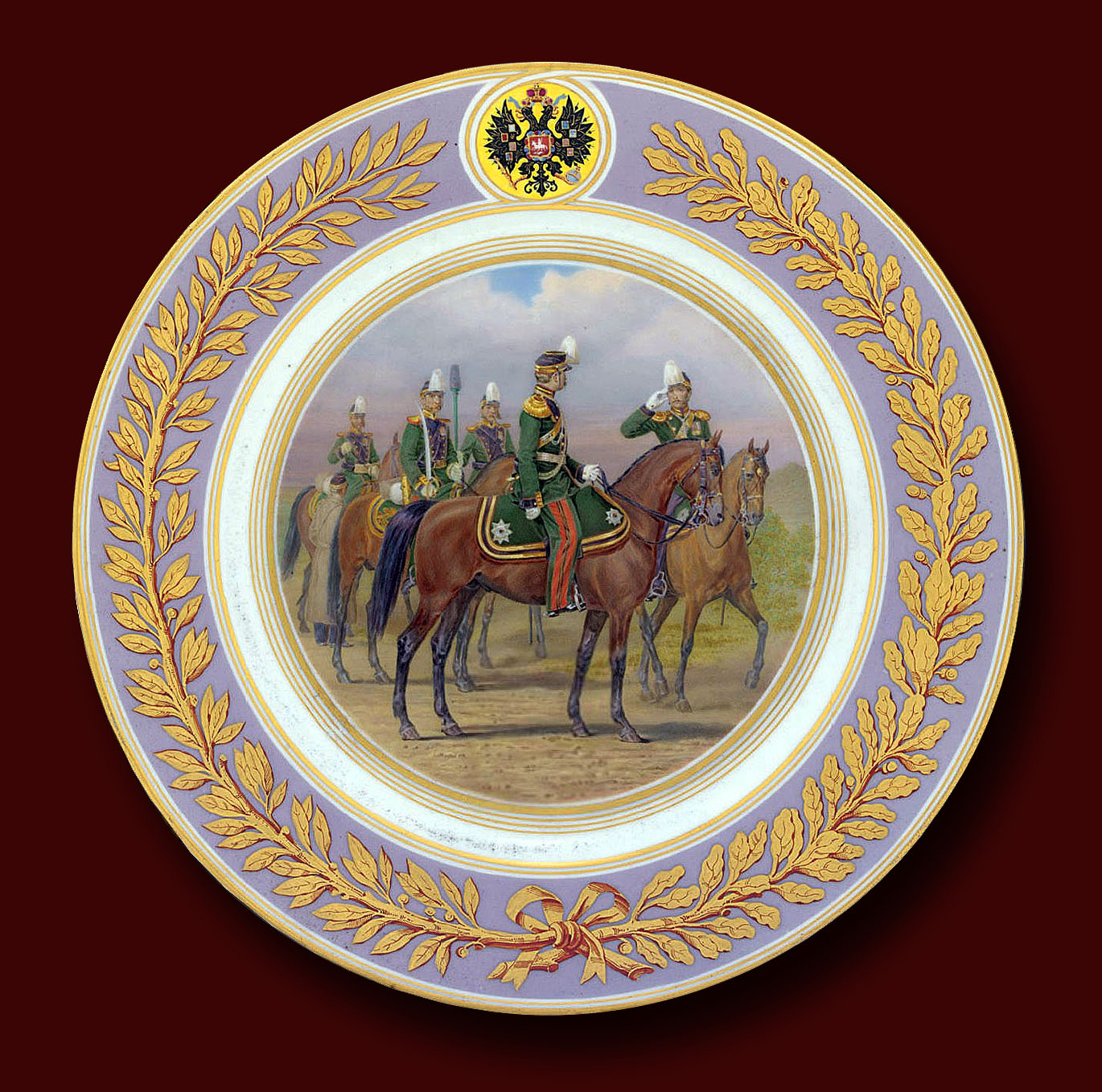 Живописная декоративная тарелка «Лейб-гвардии Конная артиллерия» Императорский фарфоровый завод декоратор - офицер конной артиллерии Василий Мидин Диаметр 24,4 см период правления Александра II Фрагмент. Смотреть полностью.