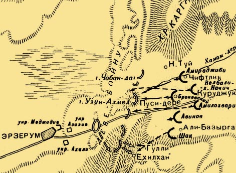 С самого начала боя, артиллерия нашего правого фланга, почти без перерыва, обстреливала левую часть возвышенности Узун-Ахмат. В течение 9-ти часового действии из наших орудий, на этой возвышенности было произведено четыре взрыва зарядных ящиков, а сел. Узун-Ахмат еще с утра дымилось в пламени, и было оставлено турками. Для окончательной же подготовки успешной атаки, наша артиллерия, с 4-х часов пополу-дни, т. е. тотчас же по очищении неприятелем предгорьев Чобан-дага, открыла самый сильный и частый огонь картечными гранатами, по траншеям и по вершине левой оконечности Узун-Ахмата. Вслед за этим, полковник князь Амираджиби, уже обеспеченный с тыла, начал наступление, имея в боевой линии два батальона (1-й и 2-й) кубинцев и три батальона eлисаветпольского полка, а во второй линии 3-й кавказский стрелковый батальон, два батальона бакинского полка и один елисаветпольскаго. Быстро и настойчиво двигаясь вперед, штурмовая колонна князя Амираджиби заняла холмы у подошвы Узун-Ахмата, но на этой позиции была встречена страшным перекрестным огнем—ружейным и крупповских орудий, перед которым мог устоять только русский солдат. С верховьев широкого оврага, идущего через Деве-Бойну, со скалистого края Чобан-дага и с траншей Узун-Ахмата, расположенных в два яруса, в нас полетела такая масса пуль и артиллерийских снарядов, о которой трудно дать, даже приблизительное понятие. Вся линия турок скрывалась в дыму, от их ружейной и пушечной пальбы.