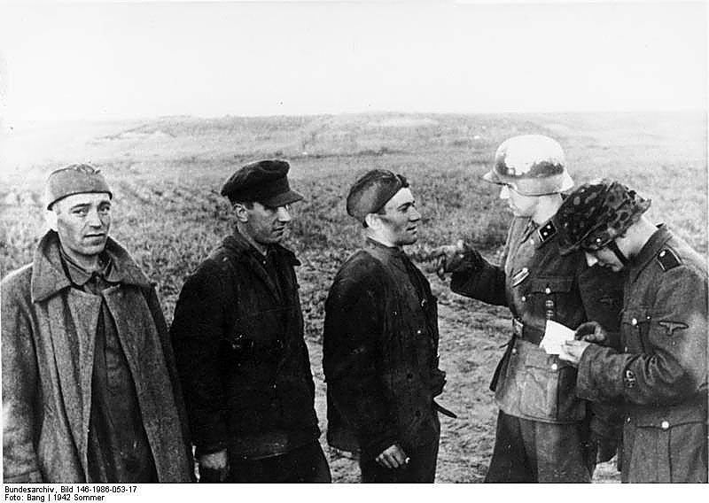 Солдаты легиона СС Norge на Восточном фронте допрашивают советских военнопленных. Фотография. Лето 1942 г. Автор неизвестен. Государственный архив ФРГ Bundesarchiv bild 146-1986-053-17
