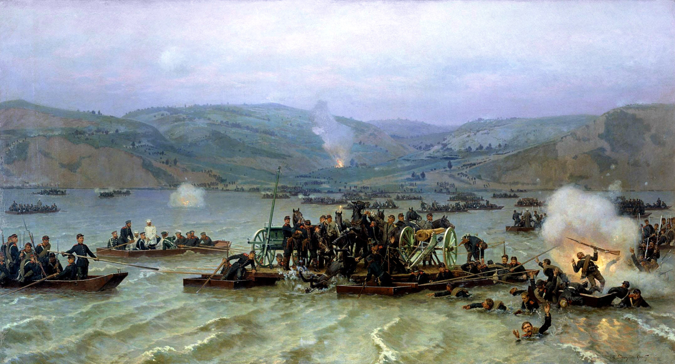 Удачный исход этой операции является ближайшим рѳзультатом основательного расчета, тщательной подготовки ее во всех смыслах: в стратегическом — путем сосредоточения прѳвосходных сил к пункту переправы и отвлечения внимания противника искусно веденными демонстрациями; потом в тактическом и техническом отношении. Меры, принятые в этом отношѳнии, в особенности те, которые касались парализации неприятельского флота на Дунае, заслуживают особѳннаго внимания. Они были указаны в своем месте. Переправа у Зимницы была исполнена настолько блестящим образом, что выше ее из прежних переправ можно будет поставить разве только классическую переправу Наполеона I через Дунай в 1809 г. перед Ваграмским сражением, и то лишь условно. Наполеону с 175 тыс. необходимо было переправиться через небольшой рукав Дуная, — так как он владел островом Лобау и близлежащими островами; нам со 120 тыс. приходилось переправиться через главное русло Дуная в 550 саж. В этом случае, задача наша была труднее; но нам приходилось исполнить эту операцию против слабых неприятельских сил, разбросанных на пространстве от Рущука до Никополя по Дунаю и до Тырнова в глубь, на 90 верст по фронту и 60 в глубину. На этом пространстве, Турки имели: сначала 2, потом 3 батальона в Систове, 6 батальонов и 1 батарею у Вардера (9 верст от Систова к Востоку), 12 батальонов в Никополе, 30 —35 батальонов в Рущуке и 3 батальона в Тырнове, всего до 60 батальонов,— полагая каждый в 600 чѳловек, 36 тыс. Для Наполеона же дело представлялось, в этом именно отношении, совсем в другом — грозном виде. Перед ним находилась между Асперном и Эслингеном сосредоточенная 150-тыс. неприятельская армия, с отдельным корпусом Розенберга у Витау. От Асперна до Витау всего 16 верст, что, во времени, значить 4 часа. Переложив же 90 верст (разстояниѳ между Рущуком и Никополем) на время, мы получим от 3 до 4 дней (переходов). И так в то время, как мы имели перед собою, на пункте, избранном для переправы, 86 тыс. нѳприятѳльских разбросанных войск, Наполеон имел перед собою 150 тыс. сосредоточенных войск. В то время как мы могли развлекать вниманиѳ противника демонстрациями на линии в 90 верст, Наполеону предстояло исполнить это лишь на 16 в. В то время как мы на переправу имели от 3 до 4 дней, Наполеон имел на нее 4 часа и сумел ее исполнить в столь короткий срок…