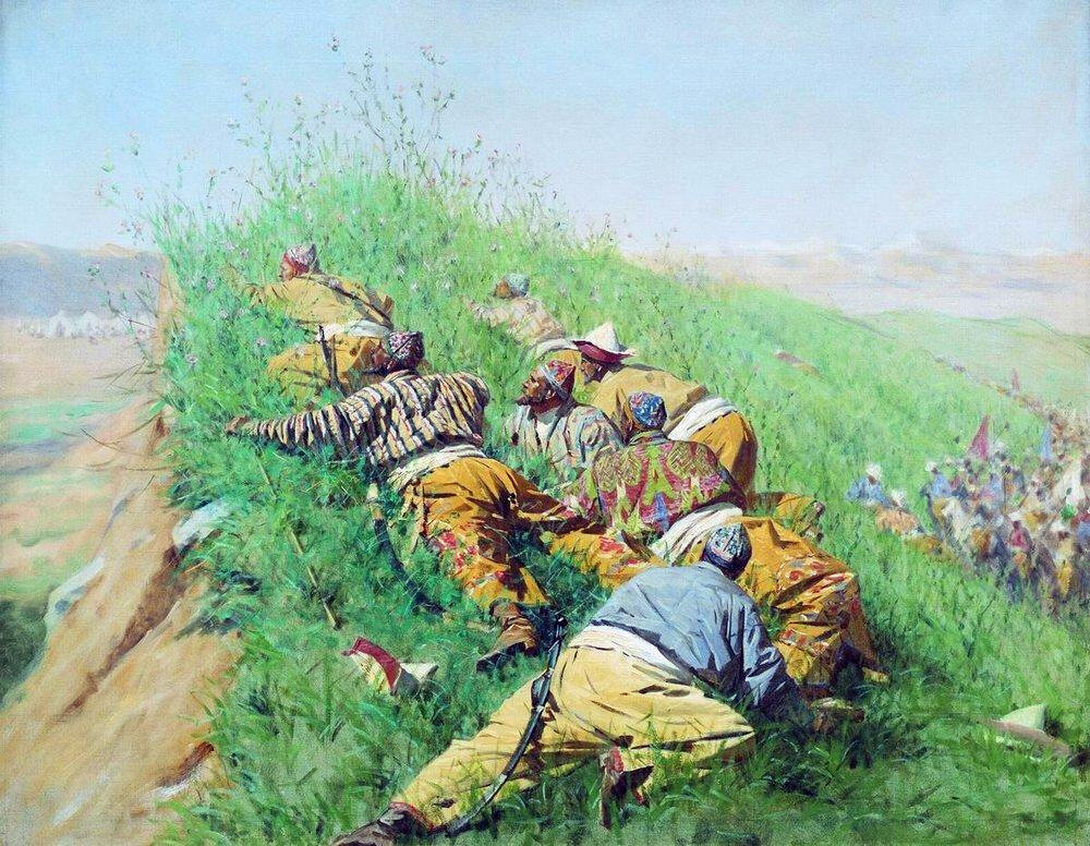 Отнятие у неприятеля стада баранов Донесение: генерала Романовского от 11 апреля 1866 года 5-го апреля была произведена, под личным начальством генерала Романовского усиленная рекогносцировка в направлении по Ходжентской дороге, с целью убедиться в верности слуха, чаще других повторявшегося, будто партия в несколько тысяч человек стоит между Ирджаром и Мурза-Рабатом, от нас верстах в 30-ти. Повторяя эти слухи, вечером 4 апреля лазутчики прибавляли к ним рассказ и еще о каких-то неопределенных намерениях противника. Производством рекогносцировки имелось также в виду очистить окрестности лагеря от легких партий, которые, исчезнув на несколько дней, опять стали показываться в виду расположения главного лагеря. . Состав рекогносцировочной колонны был из 4 рот пехоты (в том числе стрелковая рота нашего батальона, под командой поручика Рукина),- 6 орудий и 2 сотни. Чтобы появиться перед неприятелем, по возможности, неожиданно, стрелковой роте нашего батальона, с 10 джигитами, приказано было выступить на рассвете, с целью верстах в 10 от лагеря присоединить к ней кавалерию. Последнюю повели на рысях от самого лагеря, приказав и остальной пехоте с дивизионом нарезной батареи по возможности, не отставать. Едва стрелковая рота успела удалиться, от лагеря верст на пять, как заметила в стороне от дороги партию конных бухарцев — человек в 50, которые пробирались к передовому казачьему пикету. Казаки в виду неприятеля спешились и, выдержав атаку, убили одного из них; остальные же, увидав подходившую роту, бросили казаков и поспешно удалились. Пройдя ближайшие к лагерю курганы Уч-Тюбе (три кургана), отряд догнал стрелковую роту нашего батальона и тут заметил в первый раз приятеля, стоявшего на Ак-Тюбе в числе около 150 человек; сзади виднелись еще какие то массы, рассмотреть который хорошо было невозможно. Посланная вперед сотня согнала противника с кургана, и оттуда ясно уже можно было рассмотреть довольно значительные колонны и партии, шедшие к нам навстречу. Стянув за курганом всю кавалерию и имея за собою роты, генерал Романовский двинулся вперед рысью против постоянно увеличивавшегося в численности неприятеля. В это время бухарская конница была в числе от 2000 до 3000; перед ней виднелись три знамя. Впоследствии от пленных мы угнали, что это были беки Самаркандский, Ура-Тюбинский и Джизакский, которые были высланы, из Бухарского отряда, действительно стоявшего на Ирджаре, для нападения на наш лагерь и для прикрытия огромного стада баранов, составлявших отчасти собственность беков, а преимущественно поднести дар при Дарьинских жителей эмиру бухарскому, по случаю празднования им в Ура-Тюбе курбан-байрама. В виду нашего наступления бухарцы, однако, стали удаляться, но пройдя верст 7 от Ак-Тюбе, и замечая отсутствие у нас пехоты, без которой они превышали нас числительностью почти вдесятеро, решились перейти в наступление и, заняв довольно выгодную для себя позицию, открыли по нас огонь из нескольких Фальконетов. Выдвинутый в ответ карьером взвод казачьей батареи с ракетною командой, охладил их решительность; затем стремительная атака казаков сбила бухарцев с позиции, и они, понеся значительный урон и побросав даже свои стада, поспешно удалились верст за 10-ть. Остановив кавалерию и дав время подойти следовавшей за казаками стрелковой роте нашего бат