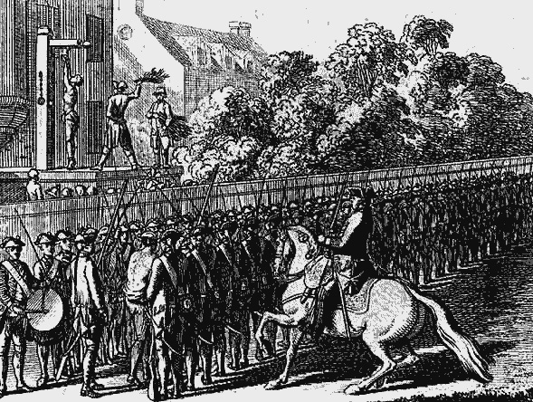 Шпицрутены. Военное наказание - проведение через строй (Spiessrutenlauf. Die Militärstrafe Gassenlaufen) Художник: Ходовецкий, Даниэль Николай (польск. Daniel Nikolaus Chodowiecki) 1726—1801 18 х 26см гравюра 1776 Фрагмент. Смотреть полностью.