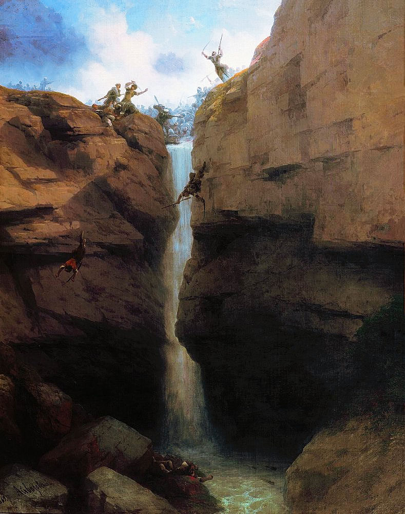 ...А за рвом, в бреши разрушенного вала, стоит здоровенный чеченец с кинжалом и шашкою в руках и грозит смертью тому, кто осмелится подойти; за ним выглядывает несколько фанатиков, готовых крепко постоять за редут. В это мгновение из тенгинских рядов выскакивает маленький солдатик, по имени Иван Бурлак, бросается на горца и всаживает ему в грудь штык по самое дуло. Чеченец с мучительным криком хватается за ружье и мертвый падает на землю. В ту же минуту раздается молодецкое «ура», Денибеков вскакивает на вал, тенгинцы за ним — и начинается штыковая работа.
