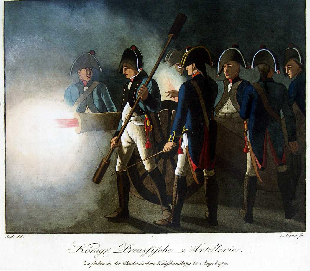 Прусская королевская артиллерия Художник: Людвиг Эбнер (Ludwig Ebner) Акватинта и офорт на меди, ручная раскраска акварелью из серии: «Характеристическое изображение наиболее примечательных европейских военных» (Charakteristische darstellung der vorzuglichsten europaischen Militars. Augsburg, 1805) 1805 Лист: 21,3 x 32,.5 см; изображение: 12 x 17,5 см Отпечатано Академической художественной мастерской в Аугсбурге, Германия Фрагмент. Смотреть полностью.