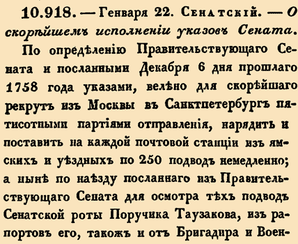 По определению Правительствующего Сената и посланными Декабря 6 дня прошлого 1758 года указами, велено для скорейшего рекрут из Москвы в Санктпетербург пятисотными партиями отправления, нарядить и поставить на каждой почтовой станции из ямских и уездных по 250 подводов немедленно; а ныне по наезду посланного из Правительствующего Сената для осмотра тех подвод Сенатской роты Поручика Таузакова, из рапортов его, також и от Бригадира и Военной Конторы Члена Нарышкина оказалось, что пятисотная партия рекрут из Москвы сюда отправляться начали, и первая 20, а другая 23 того ж Декабря уже отправлены, а на почтовых станциях подводы не то число, как по указу из Сената по 250 на каждой станции поставить велено; но до Новгорода отсюда (кроме ямских0 уездных по некоторому числу нет; а от Новгорода до села Яжелбиц ямских по 50 поставлены, а уездных в Бронницком яму 76, в деревне Зайцов 56, в Крестецком яму 42... и тако де в проезде пятисотными партиями чинится остановка, что на одних санях человек по 7 и по 8 принужденны везти<...>