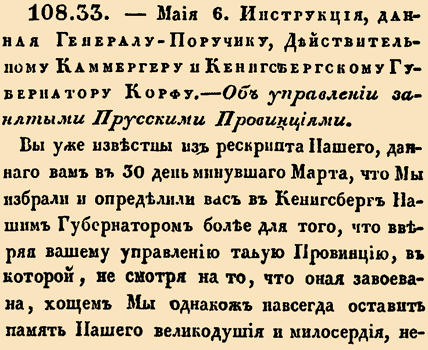108. 1758 год. (6 мая). 33. Инструкция, данная Генерал-Поручику, Действительному Камергеру и Кенигсбергскому Губернатору Корфу. Об управлении занятыми Прусскими Провинциями