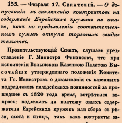 155. 1826 год. 2 марта (17 февраля ст.ст.) Сенатский. О допускании к заключению контрактов на содержание Еврейских кружек не иначе, как по предъявлении соответственных сумм откупа торговых свидетельств. Правительствующий Сенат, слушав представление Г.Министра Финансов, что при исполнении Волынскою Казенною Палатою Высочайше утвержденнаго положения Комитета Гг.Министров о довзыскании с казенных подрядчиков гильдейских повинностей за прошедшее с 1820 года время, встретился вопрос: подлежат ли платежу оных содержатели Еврейских кружек или сбора с рези, скота и птиц, так как контракты заключены с ними не на казенный подряд, а на общественный
