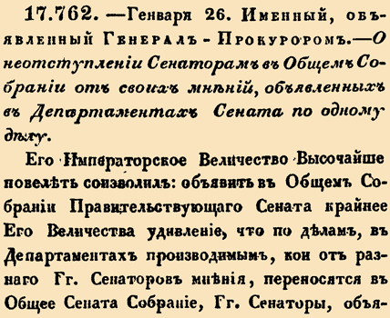 17. 1797 год. (26 января). 762. Именный, объявленный Генерал-Прокурором. О неотступлении Сенаторам в Общем Собрании от своих мнений, объявленных в Департаментах Сената по одному делу