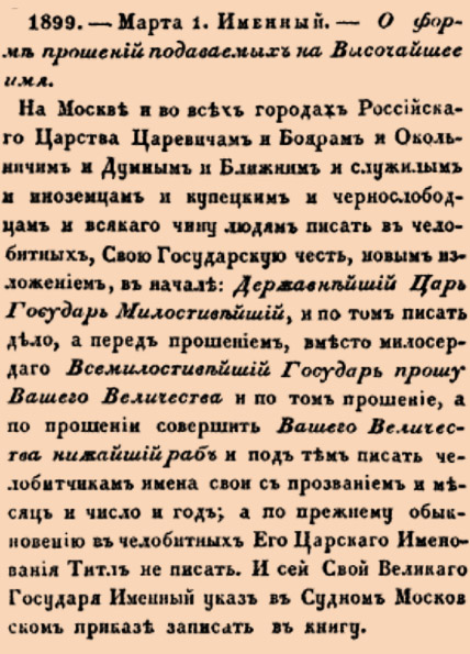 1899. 1702 год. 1 марта (12 марта). Именный. О форме прошений подаваемых на Высочайшее имя.
