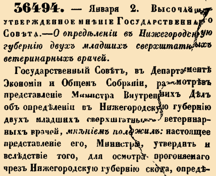 Государственный Совет, в Департаменте Экономии и Общем Собрании, рассмотрев представление Министра Внутренних Дел об определении в Нижегородскую губернию двух младших сверхштатных ветеринарных врачей, мнением положил: настоящее представление его, Министра, утвердить и вследствие того, для осмотра прогоняемого чрез Нижегородскую губернию скота, определить в сию губернию, в виде опыта на три года, двух младших ветеринарных врачей с производством им жалования по 200 руб<...>