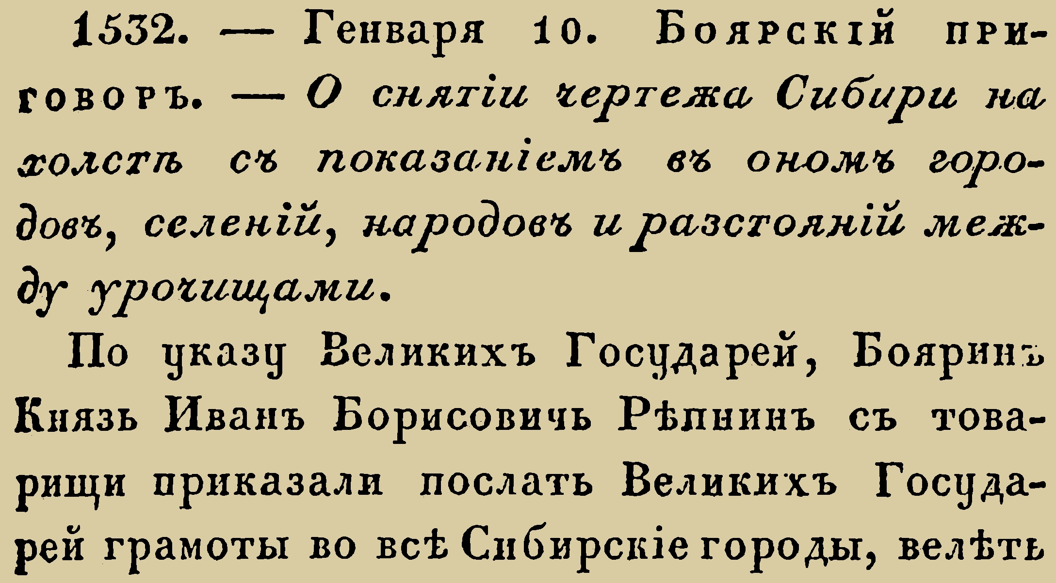 1532.- Генваря 10. Боярскій приговоръ.- О снятіи чертежа Сибири на холстѣ съ показаніемъ въ ономъ городовъ, селеній, народовъ и разстояній между урочищами.