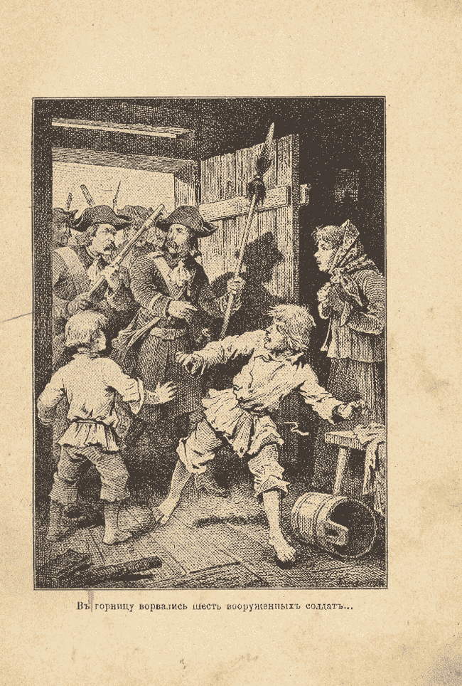В горницу ворвались шесть вооруженных солдат… Иллюстрация в книге