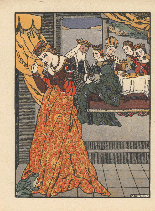 Царевна отперла дверь, лягушка прыгнула в комнату. Иллюстрация в книге