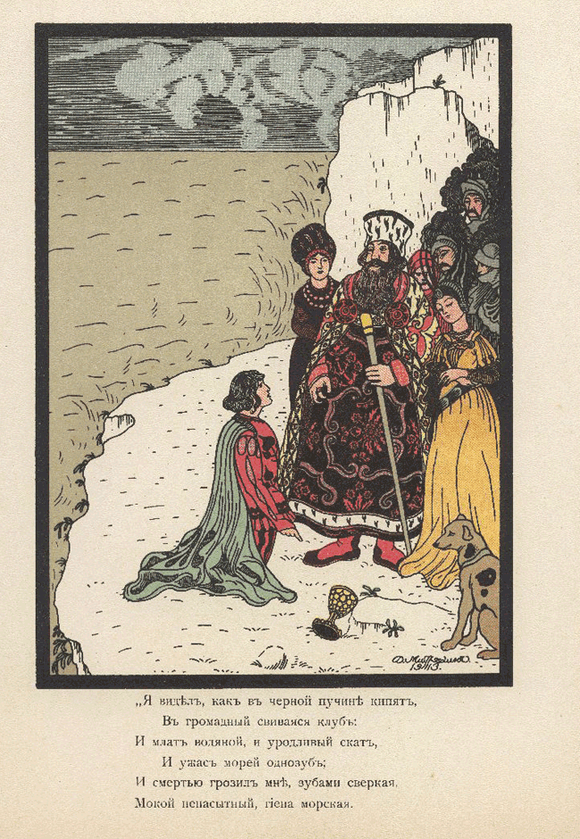Он на берег вышел; он встречен толпой; К царевым ногам он упал; И кубок у ног положил золотой… Иллюстрация к книге
