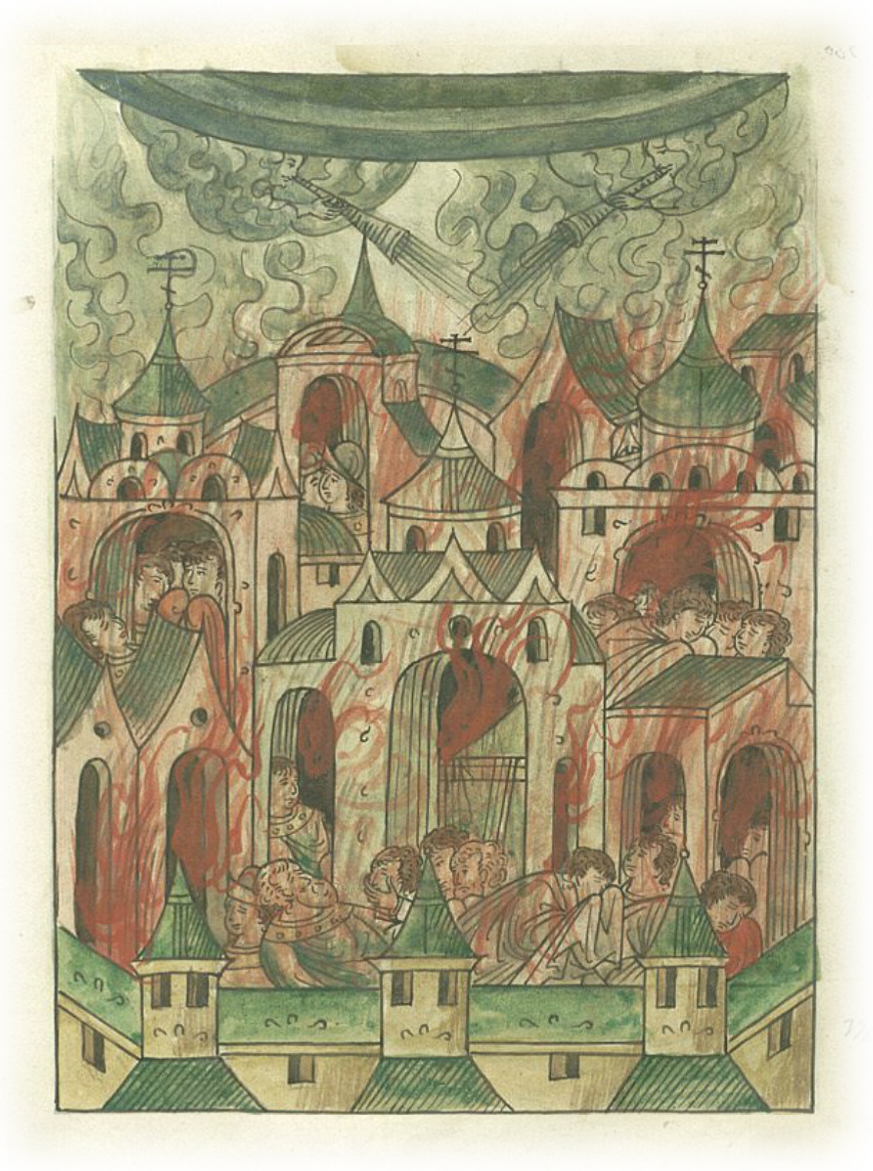 В 6808 (1300) году. Пожар был в Новгороде великий очень, с ветром и с вихрем, и много святых церквей и людей сгорело.