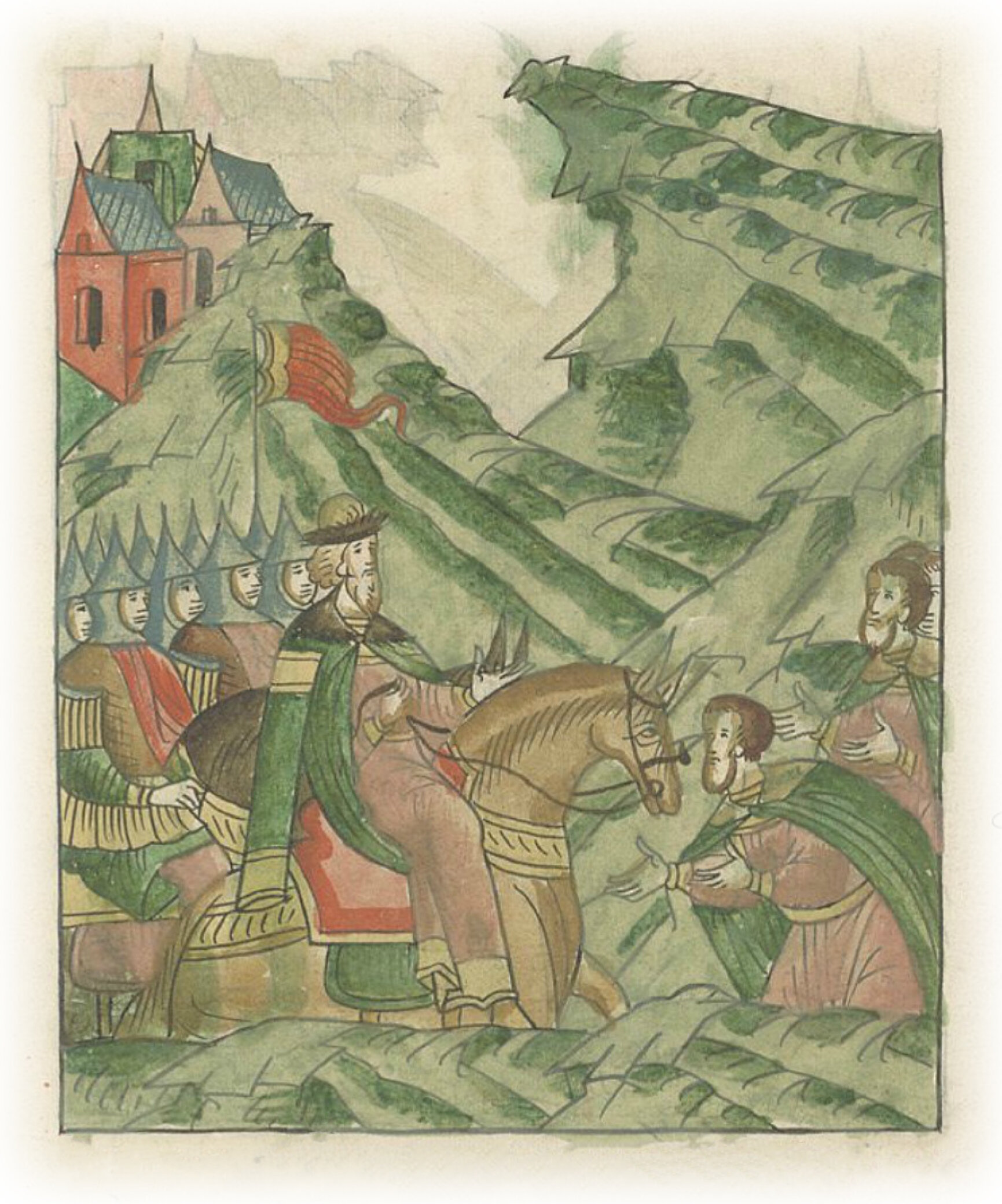 Новгородский посадник Григорий Михайлович Тучин встречает великого князя Ивана Васильевича на Волочке и просится к нему на службу.