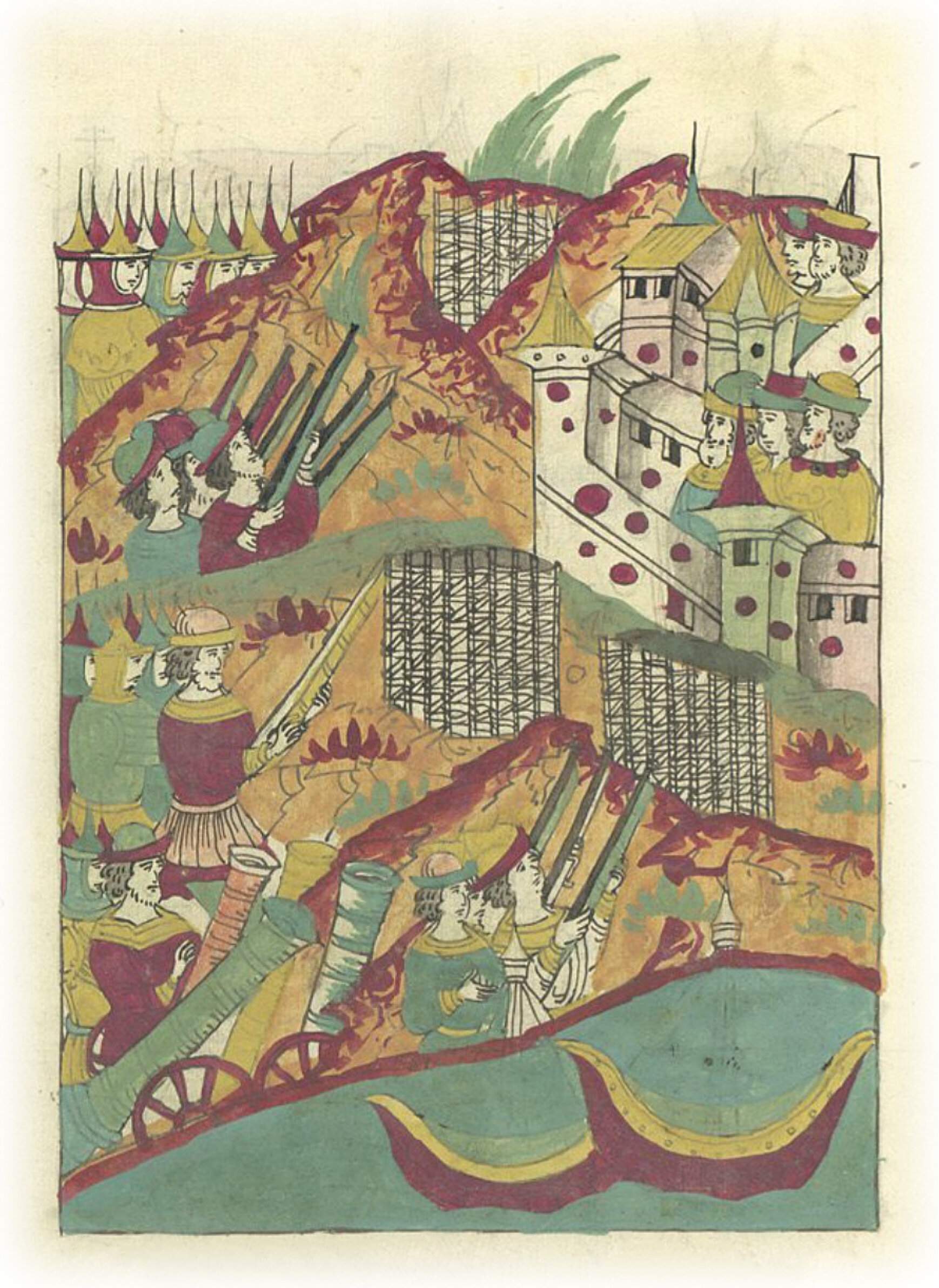 Взятие Юрьева. Воеводы, придя к городу, выкатывают пушки из судов, а стрельцы закапываются перед турами и сбивают немцев с городских стен.