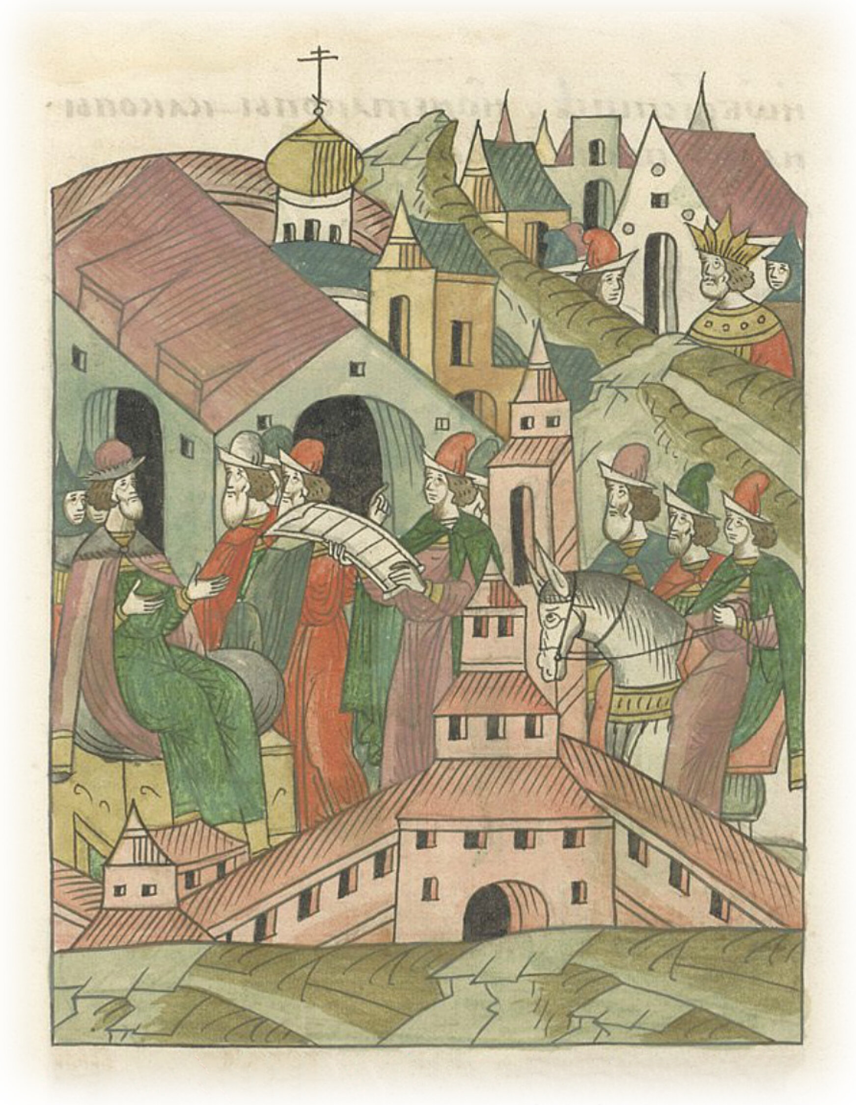 Послы от Крымского царя Менли-Гирея приходят в Москву к великому князю Василию Ивановичу с клятвенными грамотами о дружбе и о братстве, но не такими, какие были нужны великому князю.