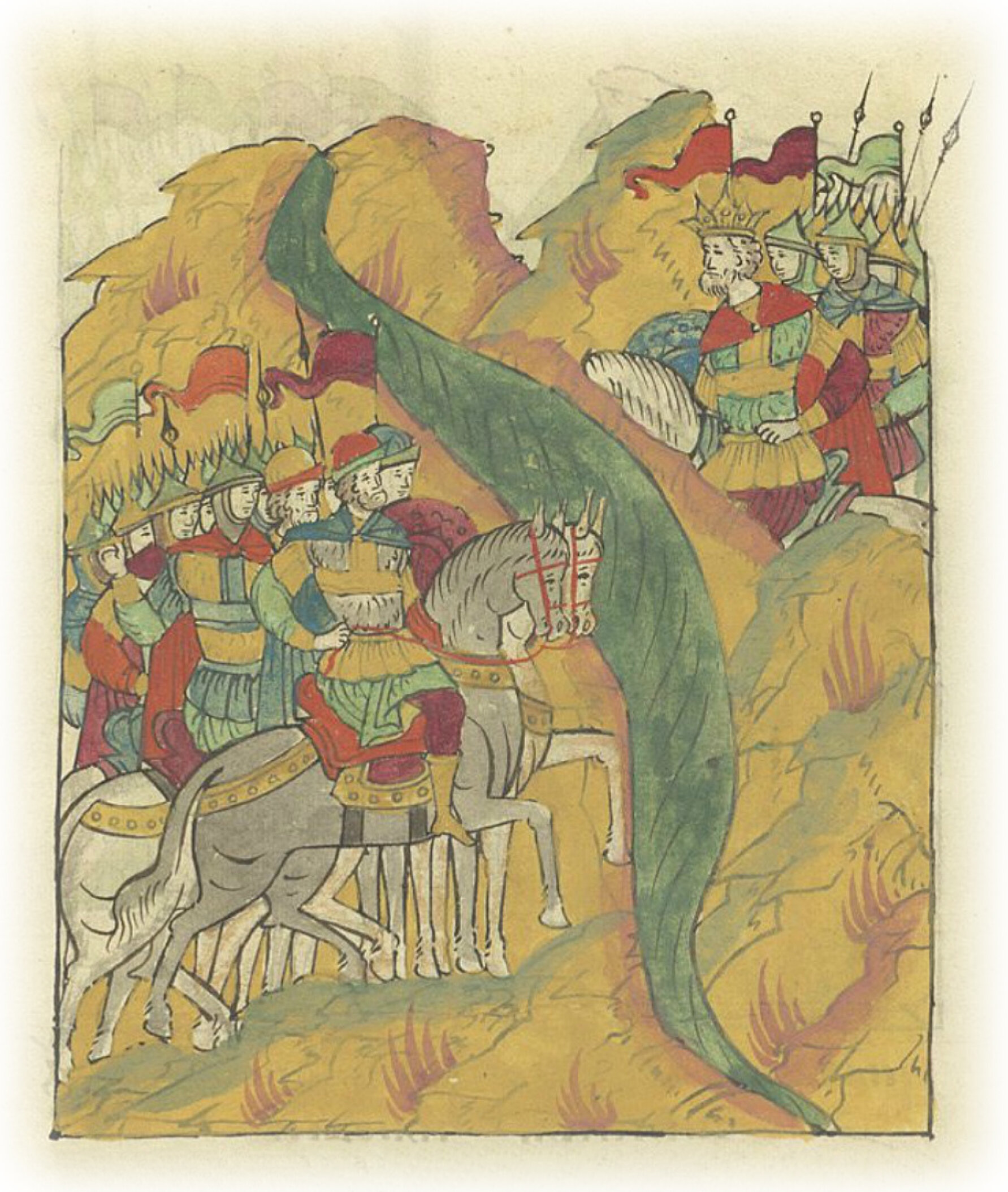И узрел царь: идут большие полки, и (полки) правой руки и левой; и начал царь смотреть и удивляться, что идут люди многие, устроены полки красиво, люди нарядны, в доспехах, каждый воевода в своем полку; и пришли против царя на берег.