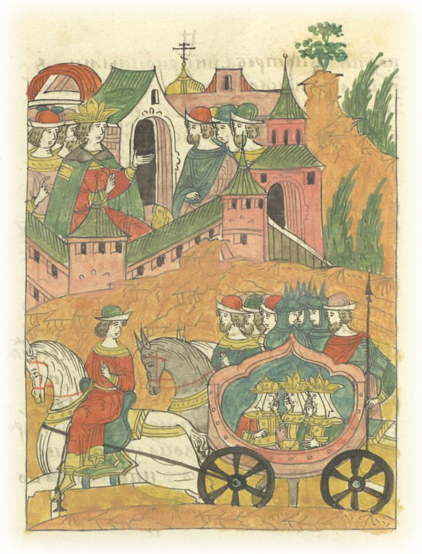 О приведении цариц астраханских в Москву. В том же месяце в 18 день в четверг привели на Москву к благоверному царю и великому государю Ивану Васильевичу всея Руси пленниц астраханских, царя Емгурчея цариц его – Тевкель да Канзаду, да младшую жену Ельякши, которые были взяты в Астрахани.