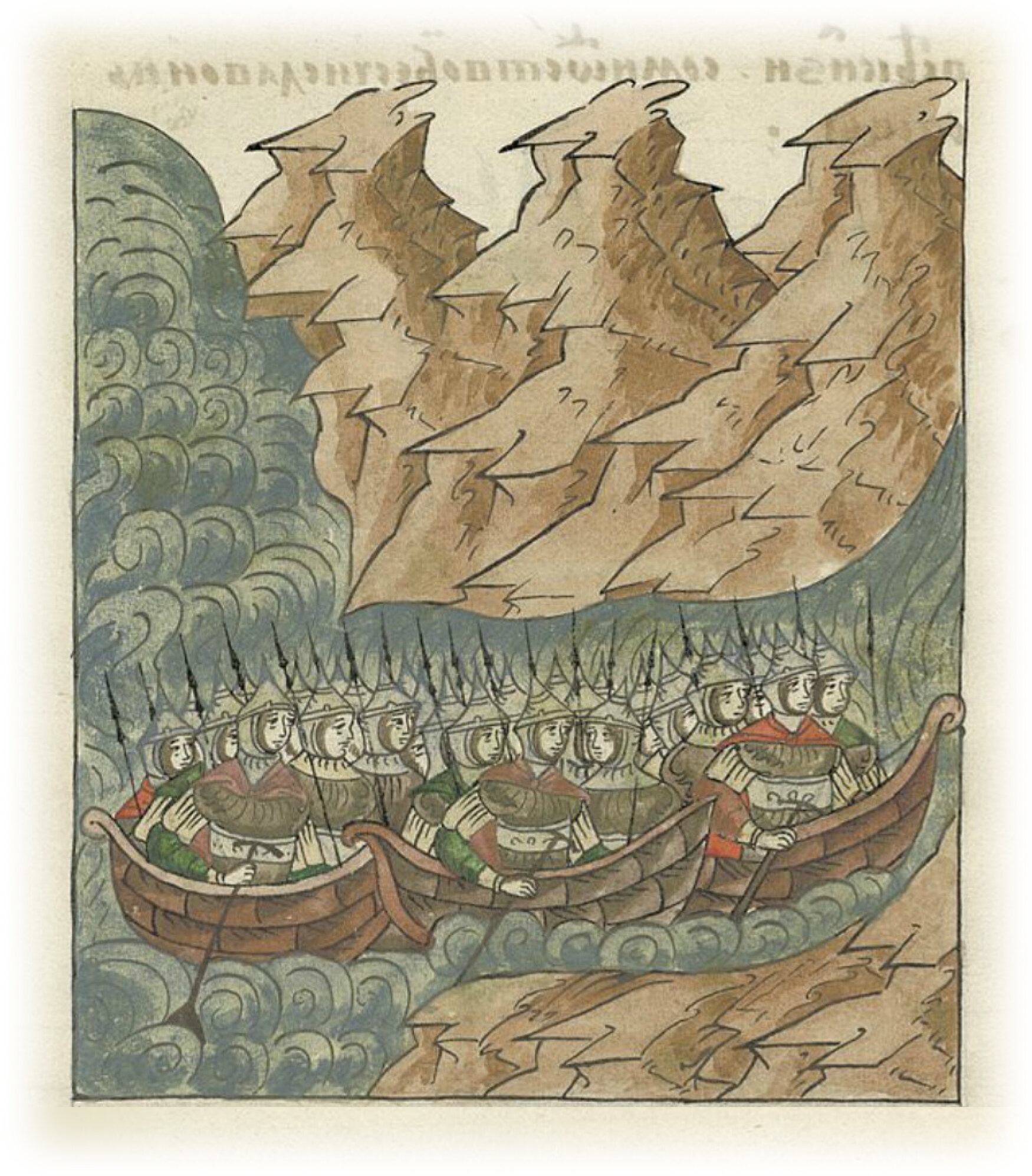 и из моря проплыли в Днепр, прошли через пороги и пришли к реке Хортице на брод на Протолче; воеводами же у них были Юрий Доморечич и Держикрай Владиславич.