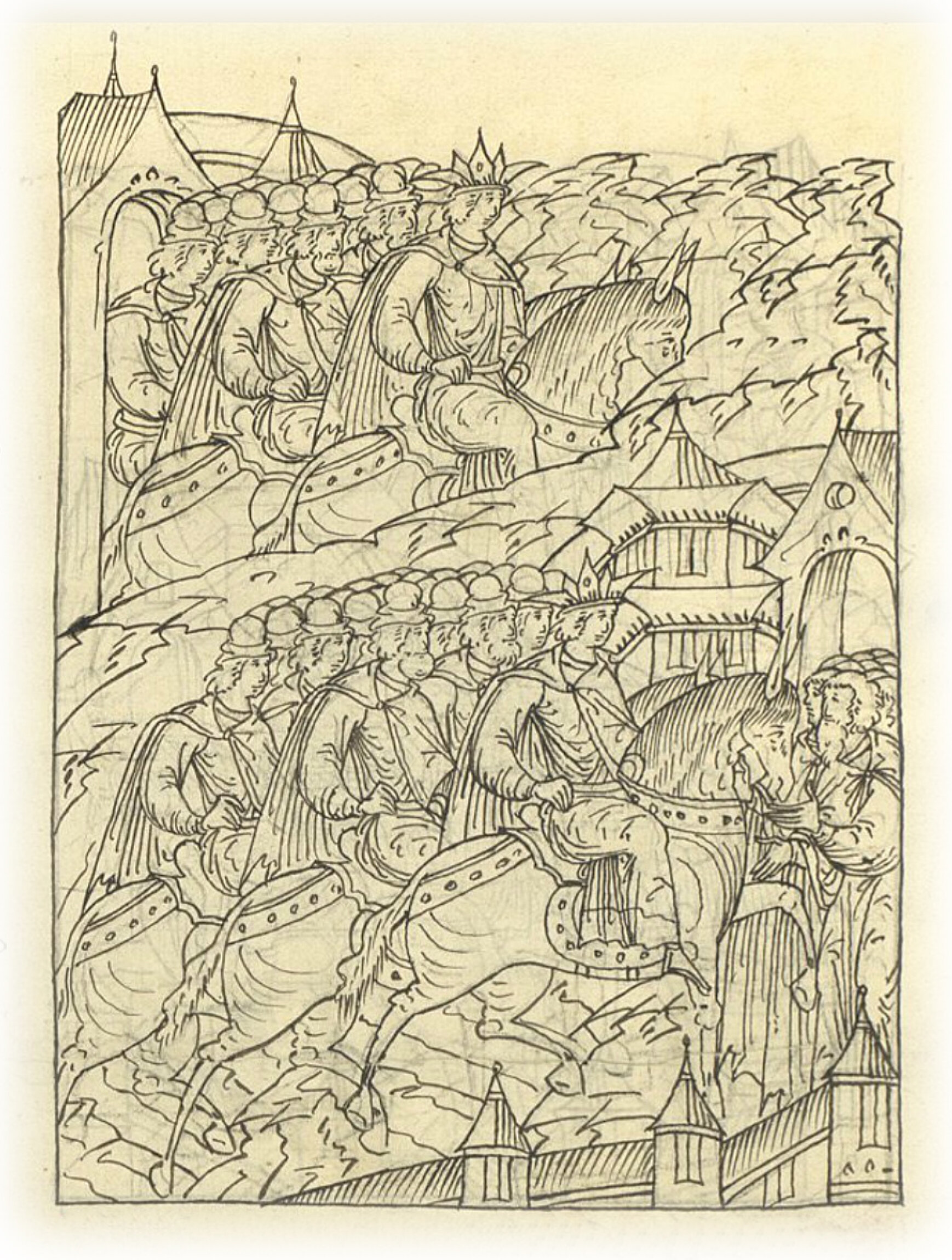 Языки говорят воеводам царя Ивана Васильевича, что магистр окопался большим рвом вокруг города Рындола, бьет из пушек и пищалей и приступает к Рындолу.