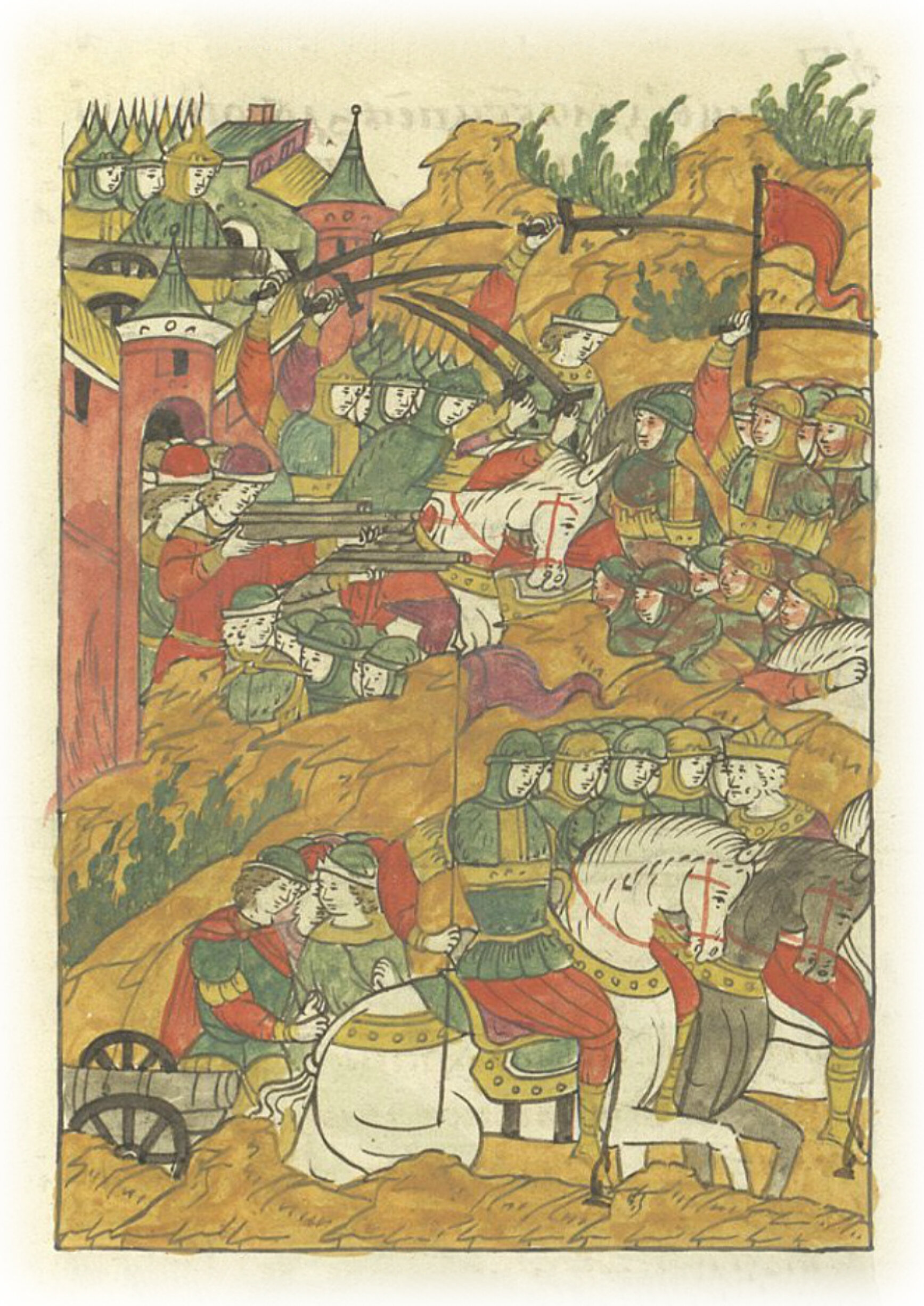 Языки говорят воеводам царя Ивана Васильевича, что магистр окопался большим рвом вокруг города Рындола, бьет из пушек и пищалей и приступает к Рындолу.
