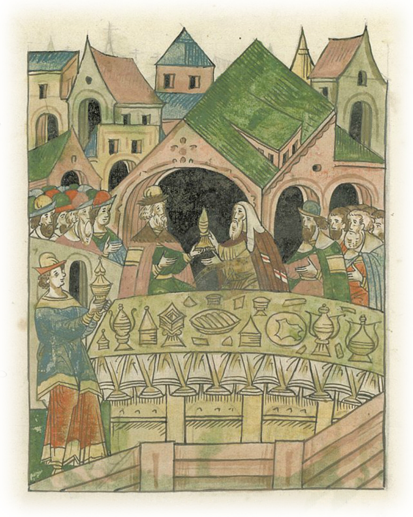 Обед у великого князя Ивана Васильевича на Городище, где присутствуют владыка, князь Василий Шуйский, посадник степенной Василий Ананьин, старые посадники, тысяцкие и бояре.