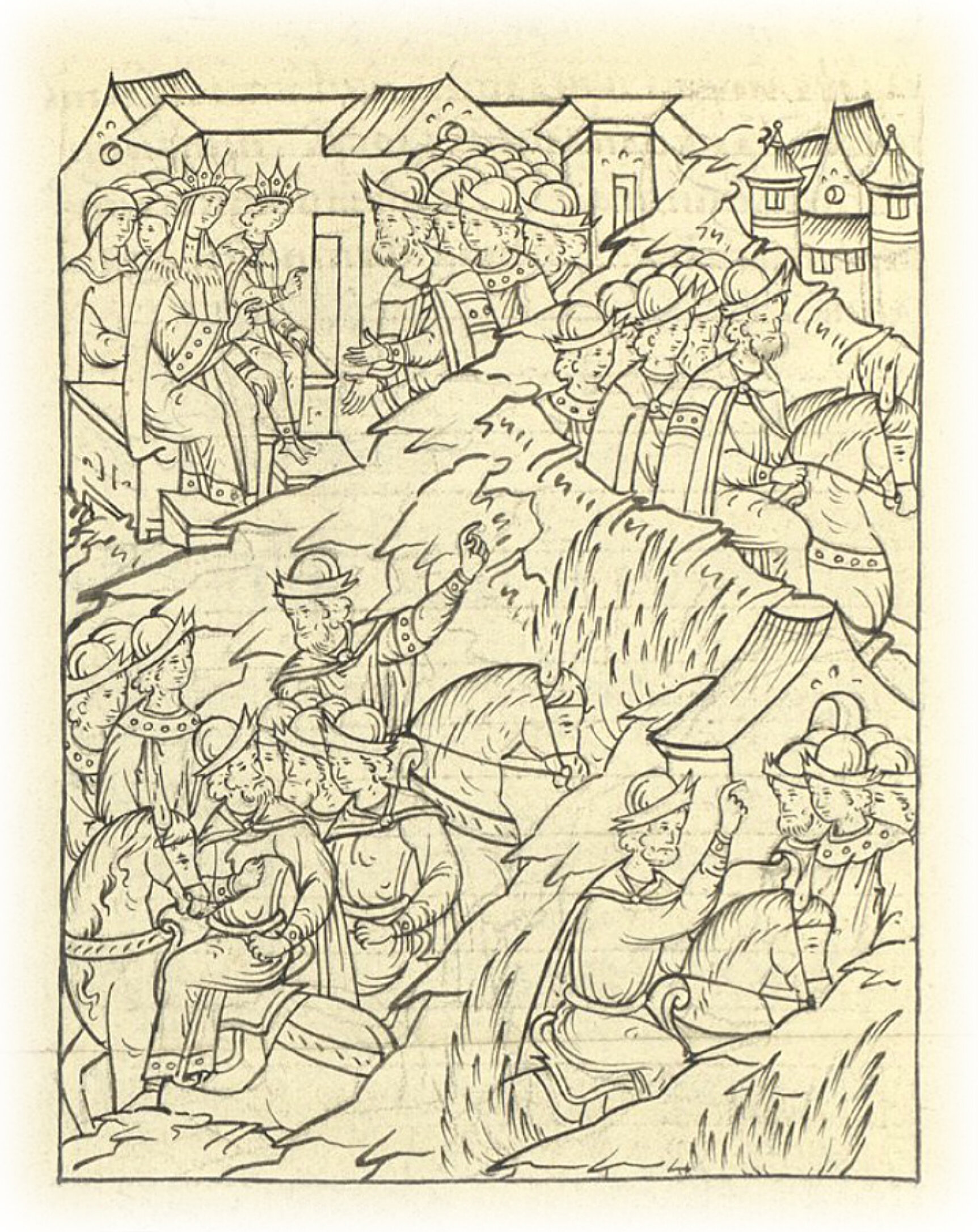 Языки говорят воеводам царя Ивана Васильевича, что магистр окопался большим рвом вокруг города Рындола, бьет из пушек и пищалей и приступает к Рындолу.