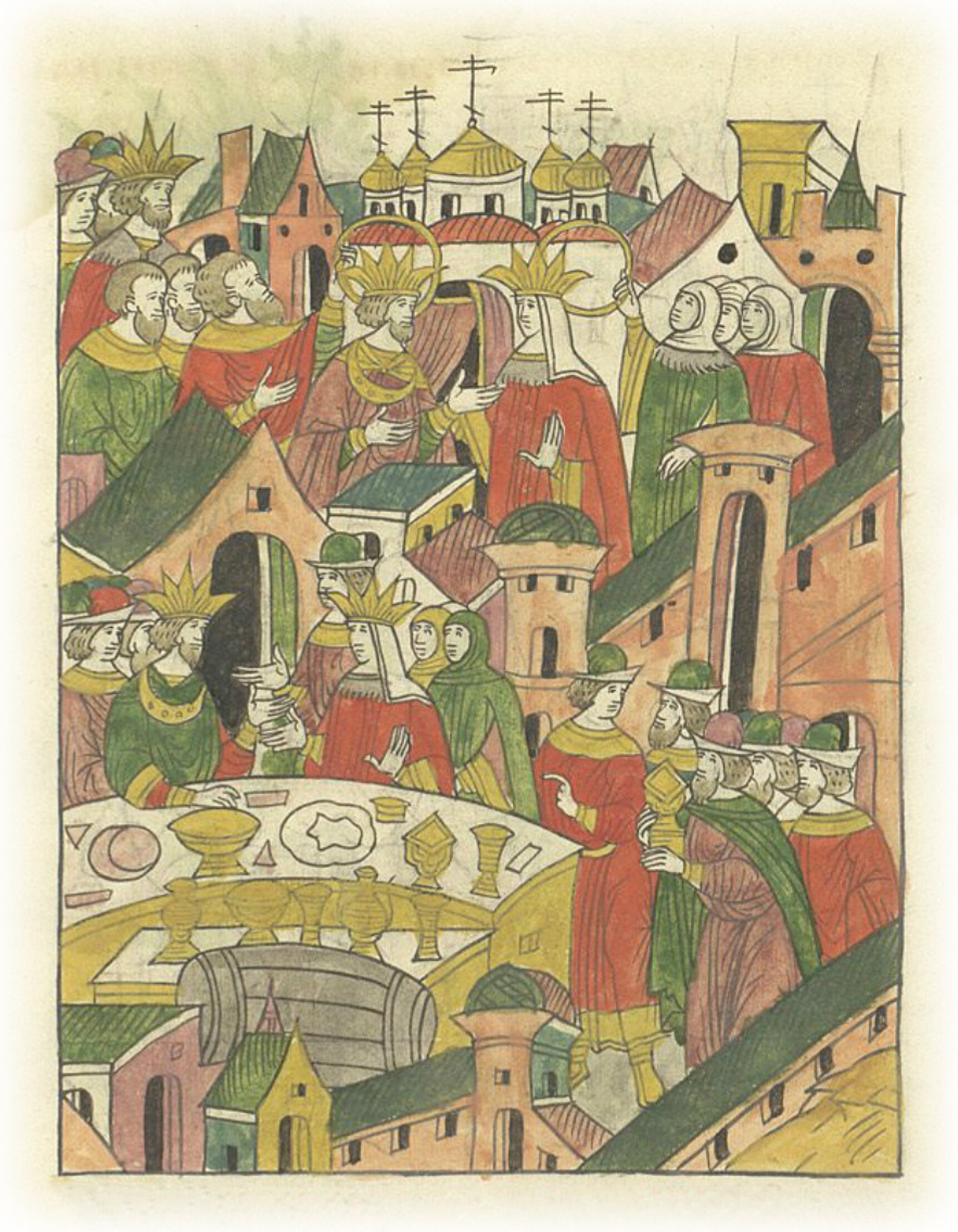 Царь и великий князь царя Симеона пожаловал, женил. В том же году в ноябре в 5 день пожаловал царь и великий князь Иван Васильевич всея Руси царя Казанского Симеона, женил, а дал за него дочь Андрея Кутузова Марью; а женил его государь на своем дворе, а венчались в церкви Благовещения на царском дворе.