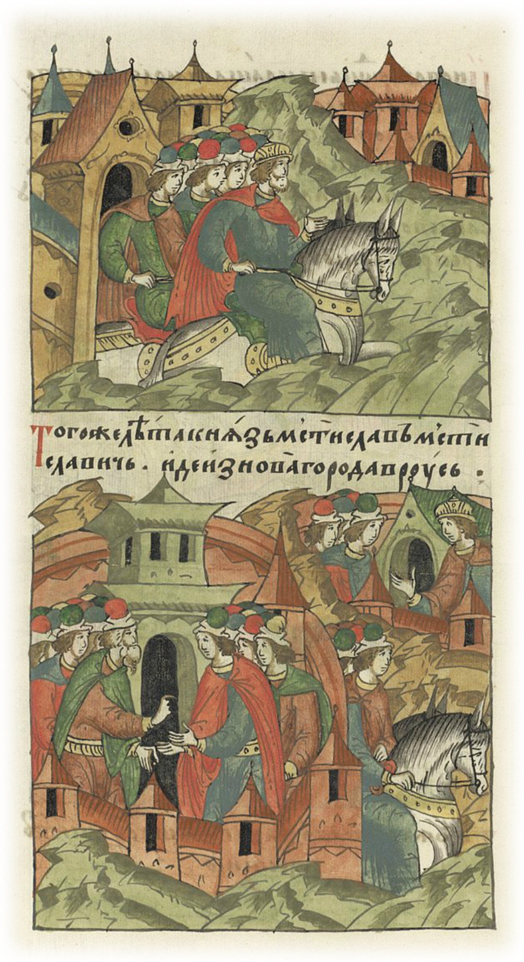 Ругодивские посадники Яким и Захар приезжают в Москву. Воеводы царя Ивана Васильевича Алексей Адашев и Иван Михайлов сообщают им, что государь пожалует их, если сдадут его воеводам помимо Ругодива Вышгород.