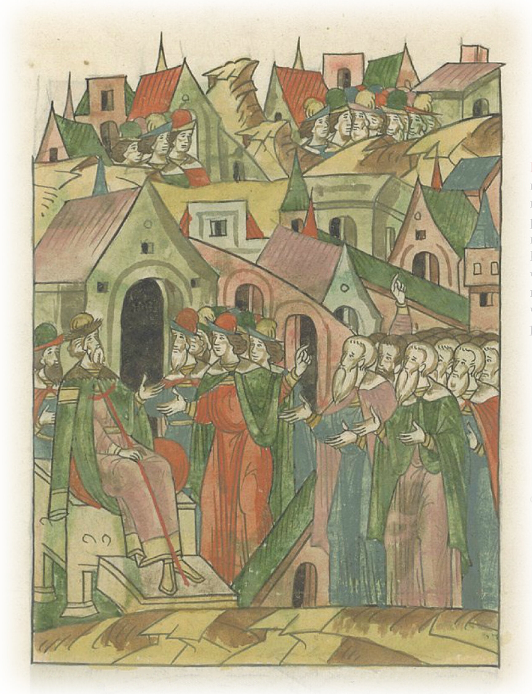 И в тот же день многие новгородцы, жалобщики, и всякие зажиточные люди, и рушане, и монастырские, и прочие из ближних пределов Новгорода пришли бить челом великому князю, а некоторые просить приставов, чтобы не были его воинами разграблены;