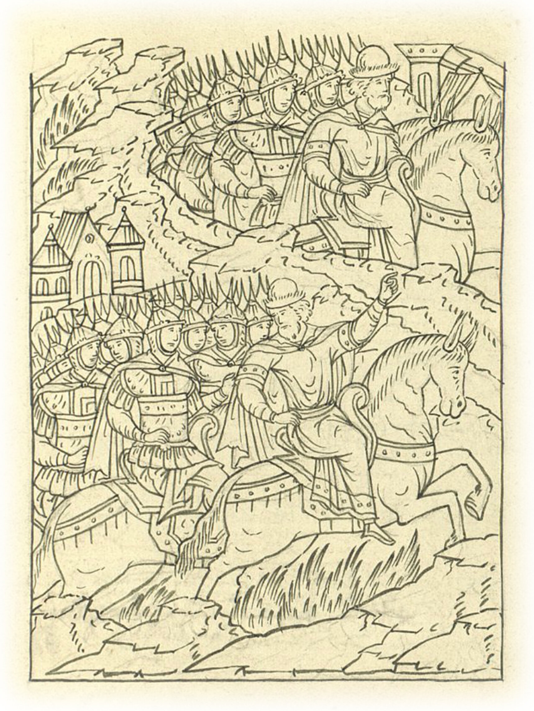 Воеводы царя Ивана Васильевича, разделившись, идут в погоню за царем Емгурчеем.