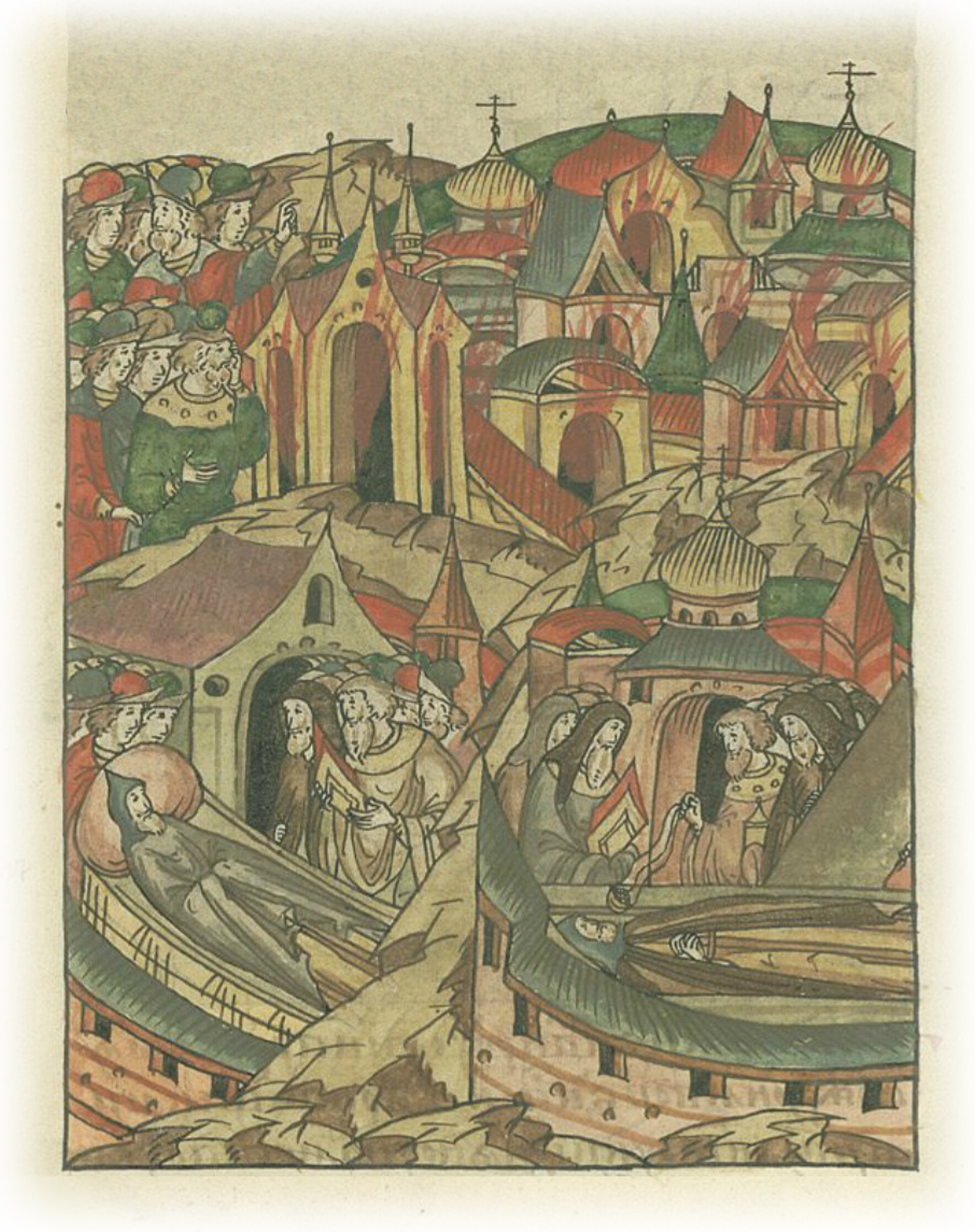 Той же весной в великое говенье преставился раб Божий Иван Родионович Квашня, нареченный в иночестве Игнатием, и похоронен был в монастыре Спаса на Всходне. В том же году в Петрово говенье, месяца июля в 22 день, в полдень, в Москве загорелся посад по вине некоего армянина Авраама, и сгорело дворов несколько тысяч, и много зла было причинено христианам.