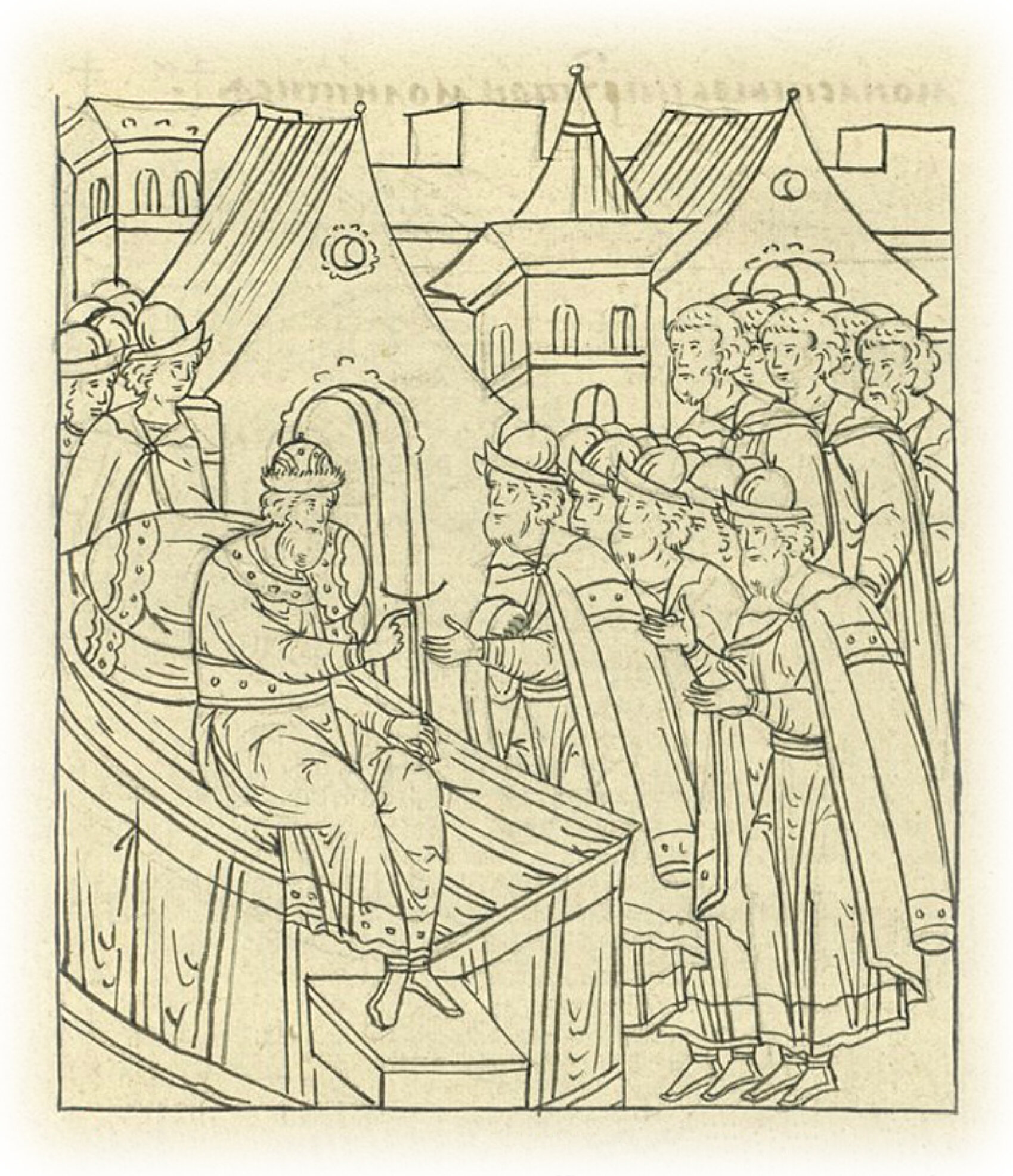 И начал мыслить князь великий с боярами; а тогда были у него бояре: князь Дмитрий Федорович Бельский и князь Василий Шуйский, и Михайло Юрьевич, да князь Михайло Львович Глинский, и дворецкие его – князь Иван Иванович Кубенский да Иван Юрьевич Шигона, и дьяки его – Григорий Меньшой Путятин и Елизар Цыплятев, Афонасей Курицын, Третьяк Раков. И начал мыслить князь великий, как ему ехать к Москве; и приговорил князь великий с боярами, чтобы ехать ему с Волока в Иосифов (Волоцкий) монастырь к Пречистой молиться.