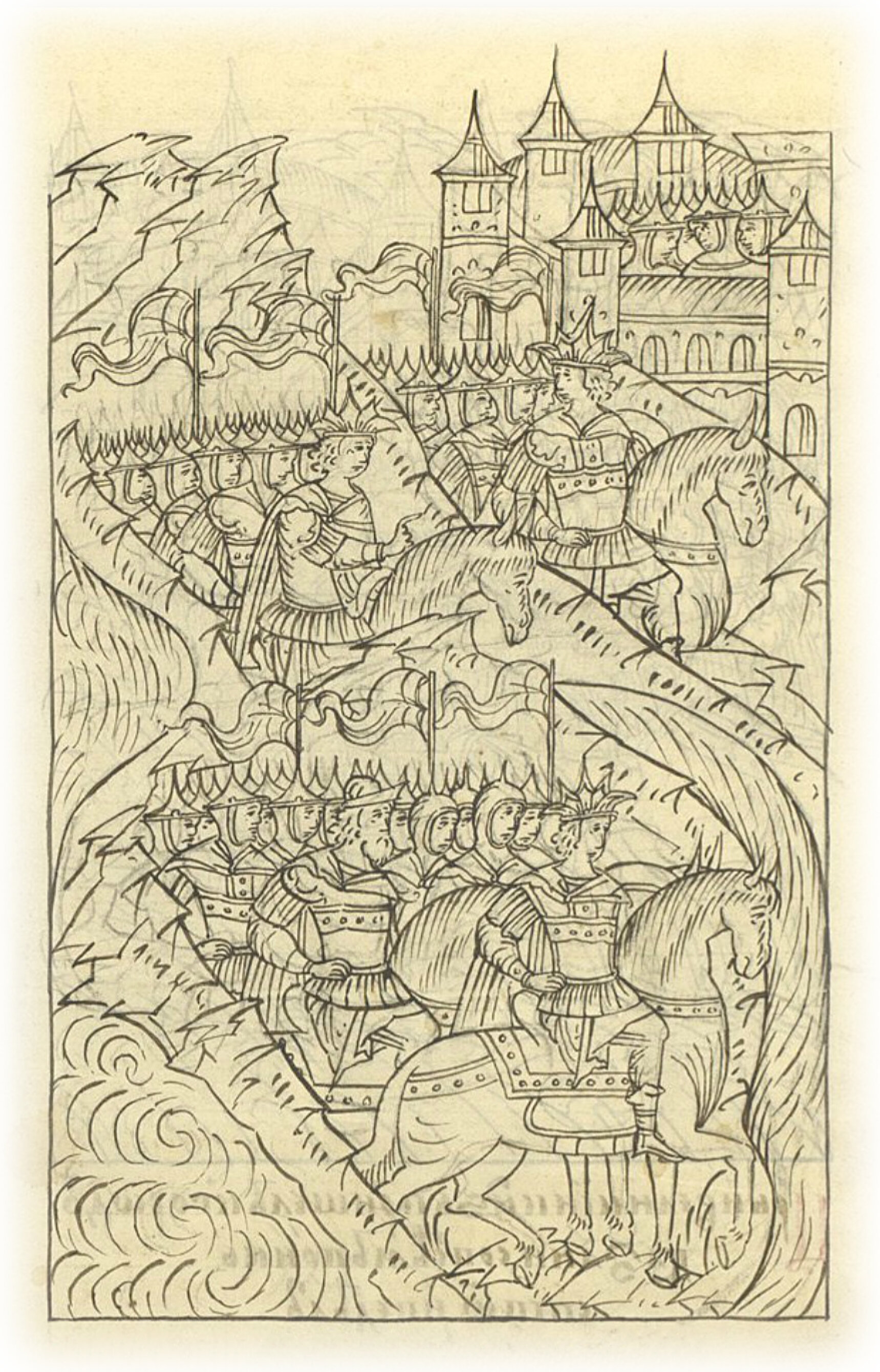 сам царь и великий князь стал у Кабана-озера; а царю Шигалею и большому полку, и передовому полку велел стать напротив города на Арском поле; а за рекою Казанью напротив города – царевичу Едигерю, (полку) правой руки и (полку) левой руки, и сторожевому полку;