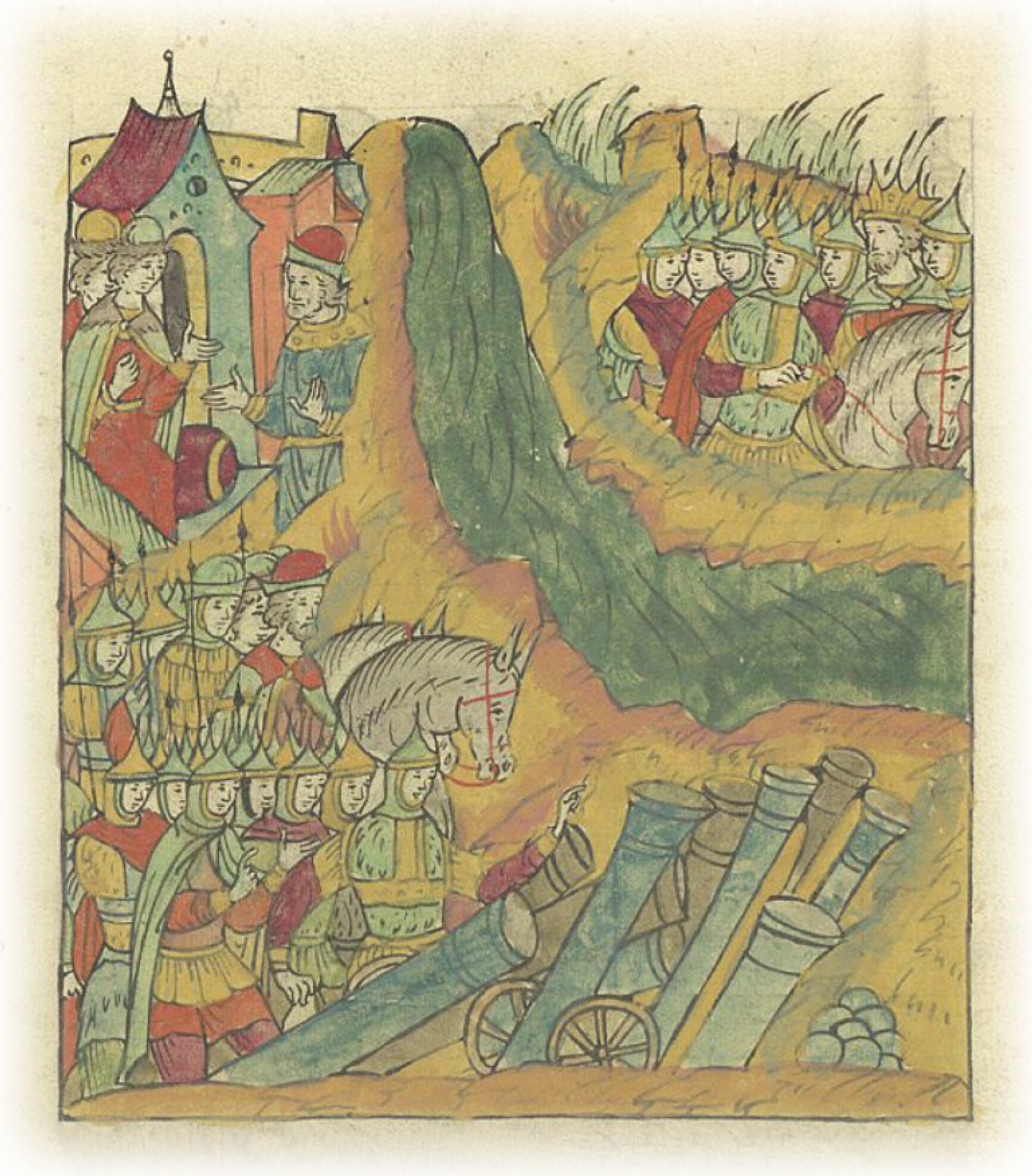 Языки говорят воеводам царя Ивана Васильевича, что магистр окопался большим рвом вокруг города Рындола, бьет из пушек и пищалей и приступает к Рындолу.