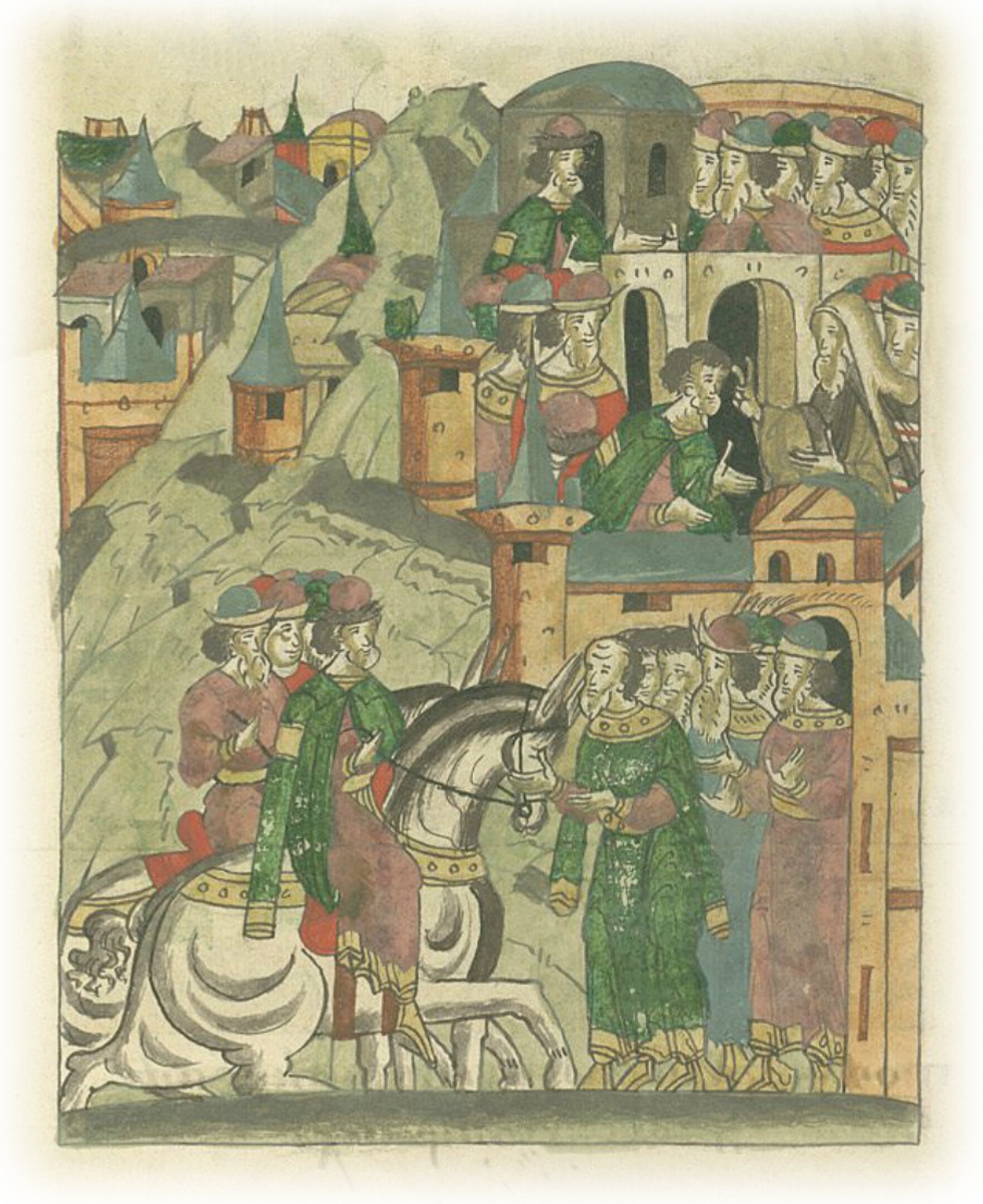 И приняли его новгородцы с почестями, благословил его Новгородский архиепископ Симеон месяца февраля в 25 день в великий Собор. И отдали ему новгородцы пригороды, которые принадлежали князю Семену Лугвению Ольгердовичу Литовскому.
